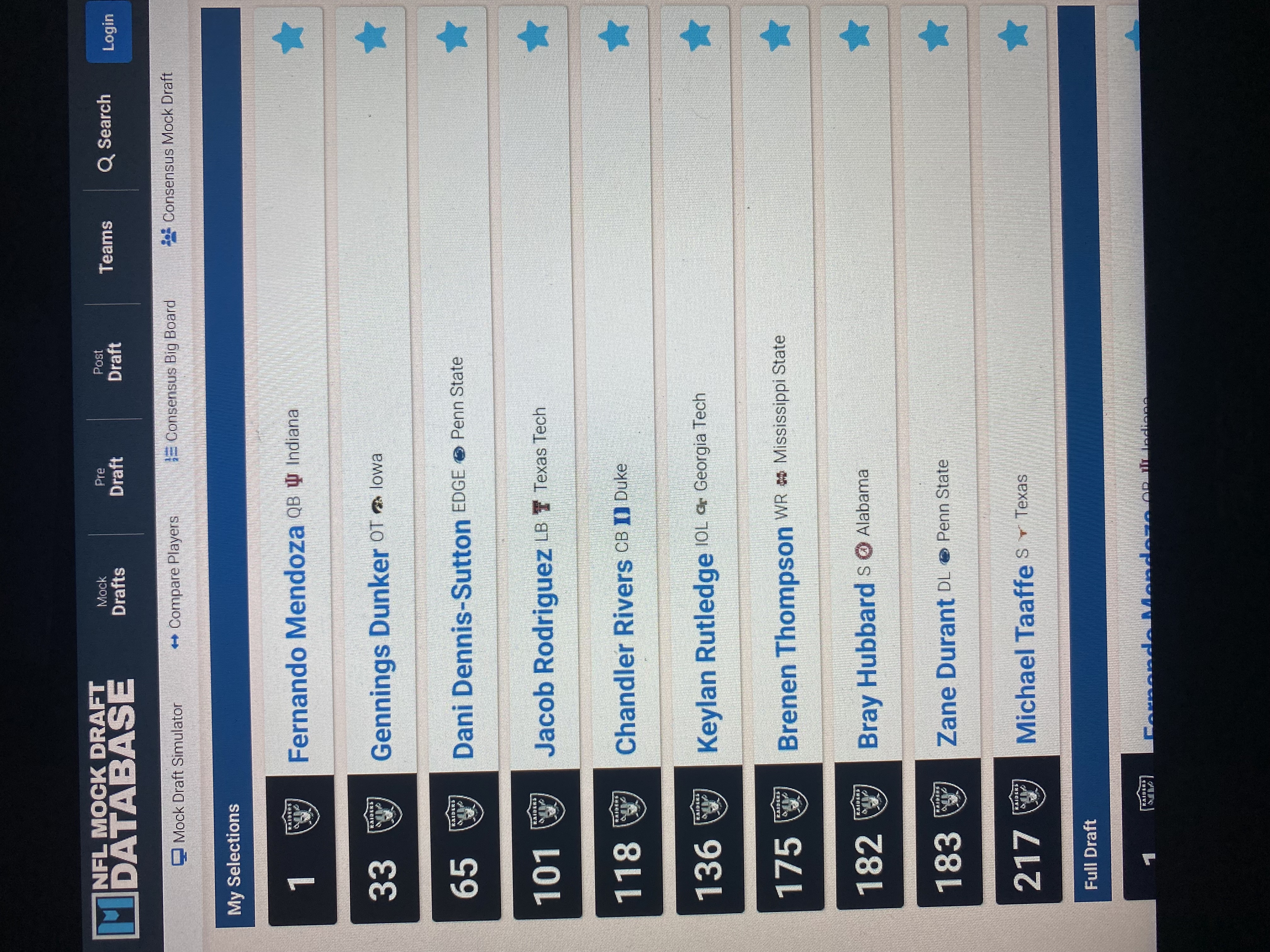 Draft: mendoza - qb of the future dunker & rutledge - better O-Line DDS, rodriguez, Durant, Hubbard - gap fillers on D Rivers, Taaffe, Thompson - rotaionals