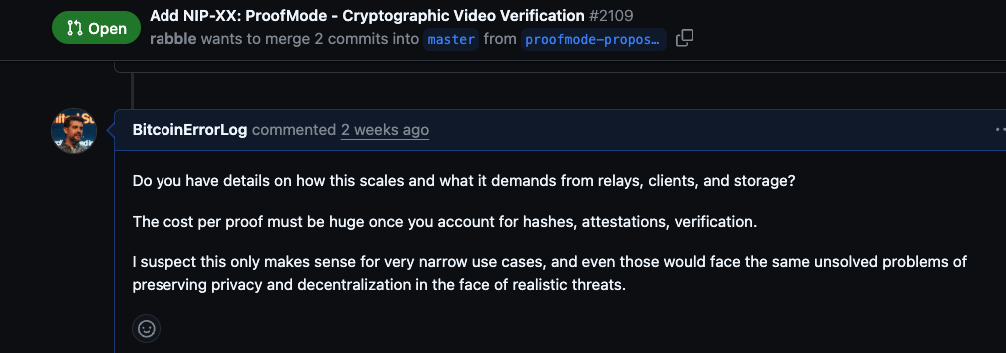 He needs drop his video-signing design, and drop Nostr as infra, if he wants to get running.