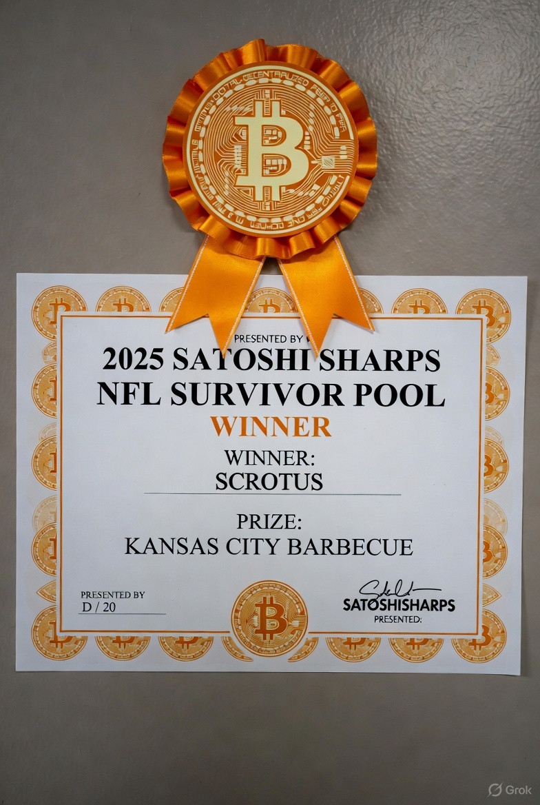 20 sats \ 0 replies \ @BitcoinMotorist OP 30 Nov \ on: Scrotus is 2025 Satoshi Sharps Survivor Champ with Eagles Loss on Black Friday! Stacker_Sports