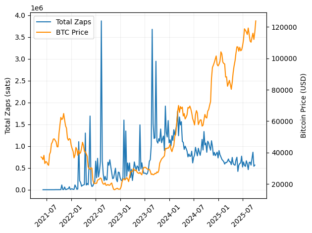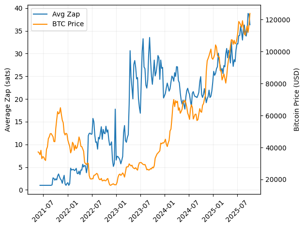 As bitcoin price went up, the average size of zaps on SN went up too.