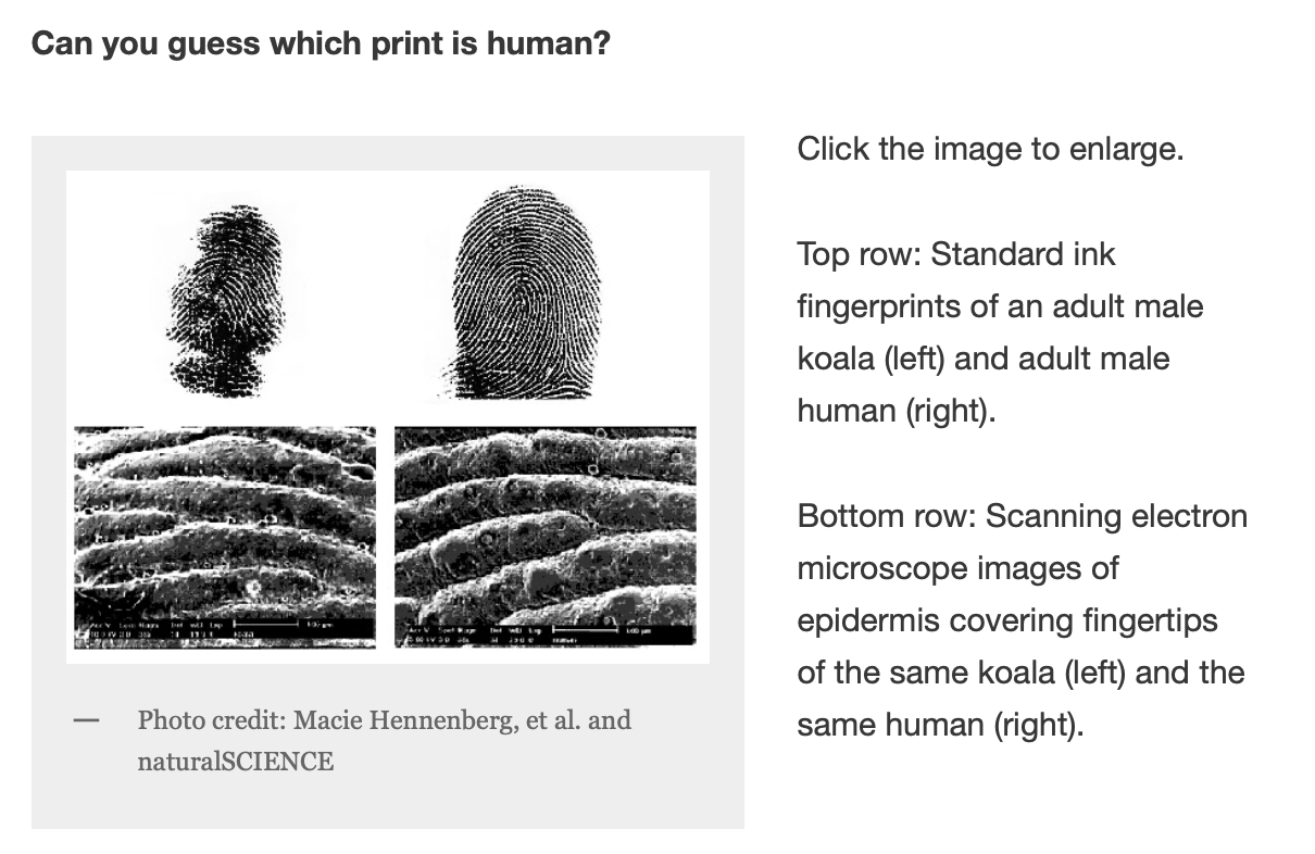 “Oddly enough, the fingerprints of koalas are nearly identical to human beings, and even under a microscope, they are basically impossible to tell apart. The shape, size and ridge patterns are bizarrely identical, even moreso than the similarities between primate and human fingerprints. However, while human beings have “dermal ridges” on their entire fingers and across their palms, koalas only have fingerprints on the tips of their fingers, where the majority of their gripping force occurs.”