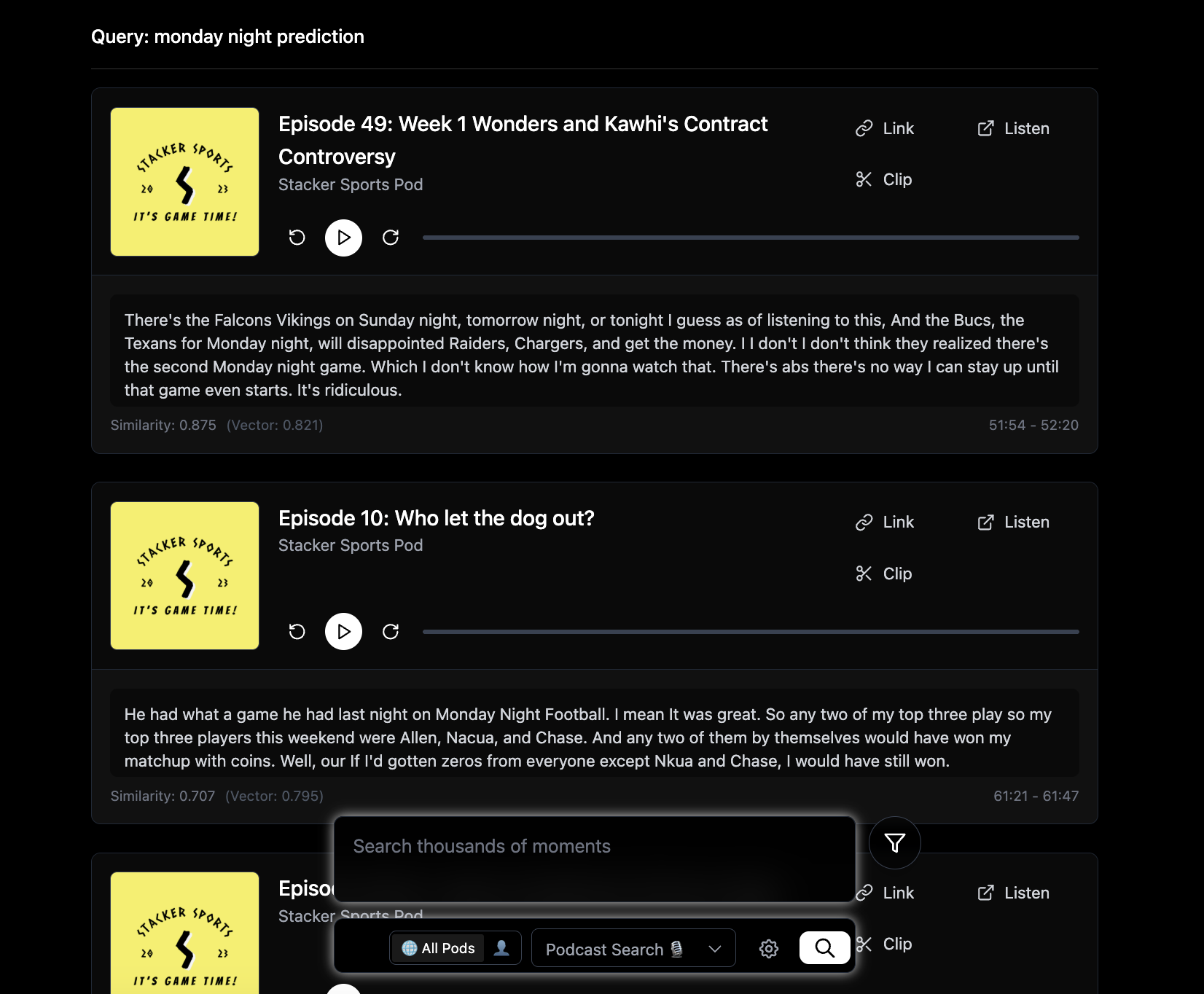 - Search Your Whole Pod: Look up pretty much anything yall talked about with fuzzy search (pic below, deeplink example )