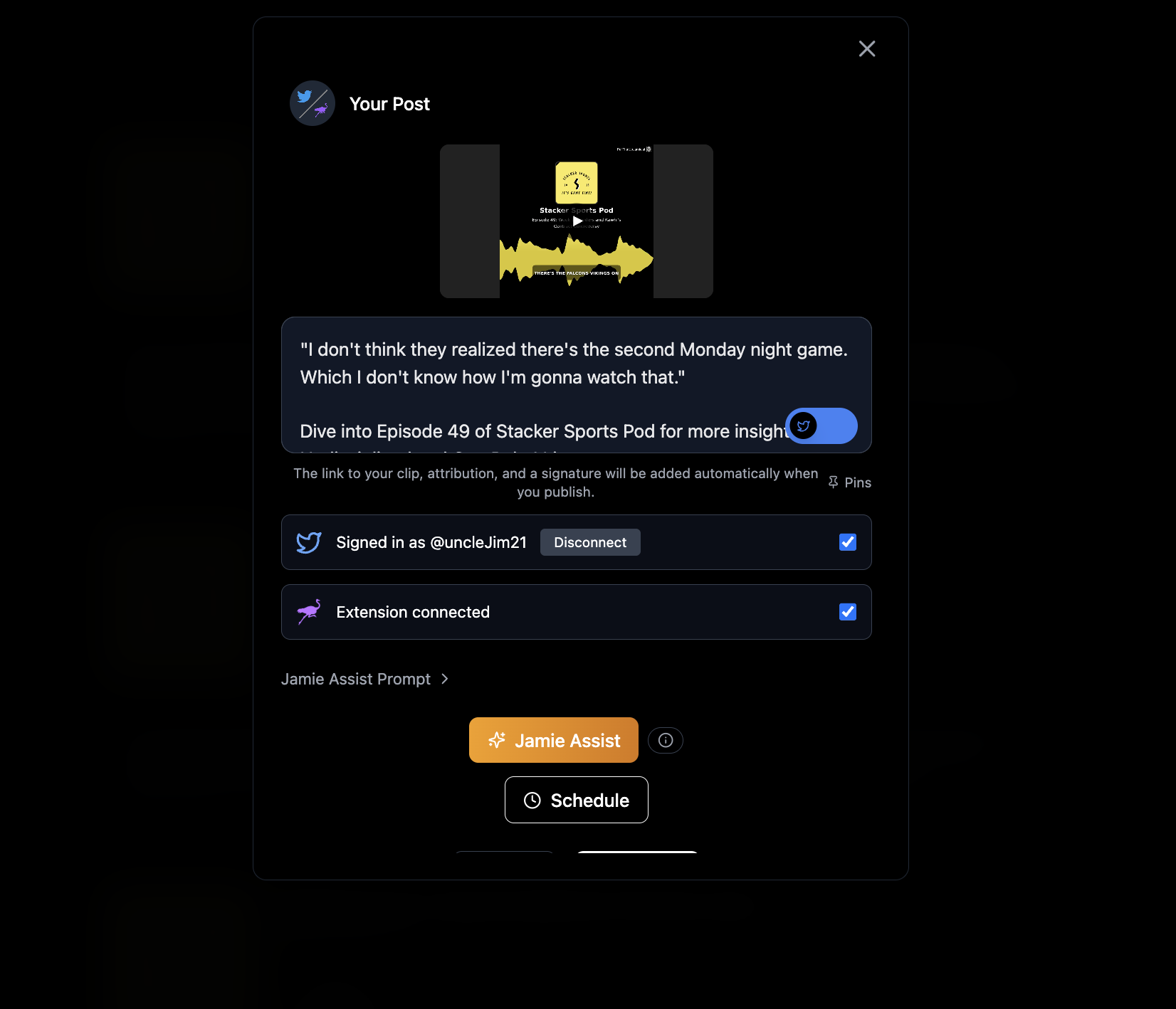 - **Jamie Pro Automatic Clipping and Podcast Promo : **Jamie automatically creates clips based on your preferences and either tees them up on a schedule or emails you to post at your own leisure: