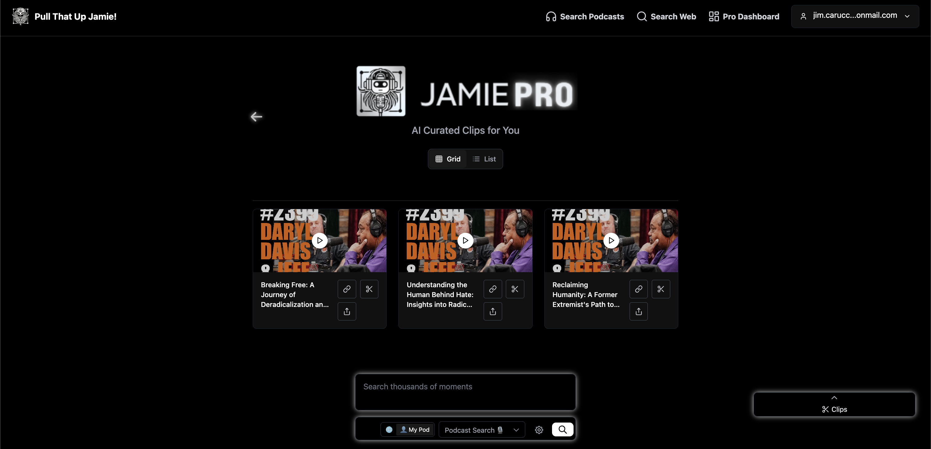 What's up GrayRuby - Not sure If I told you about it already but I created PullThatUpJamie.ai which helps a bunch of podcasts save time and money avoiding searching their own pod, making clips or hiring an editor.