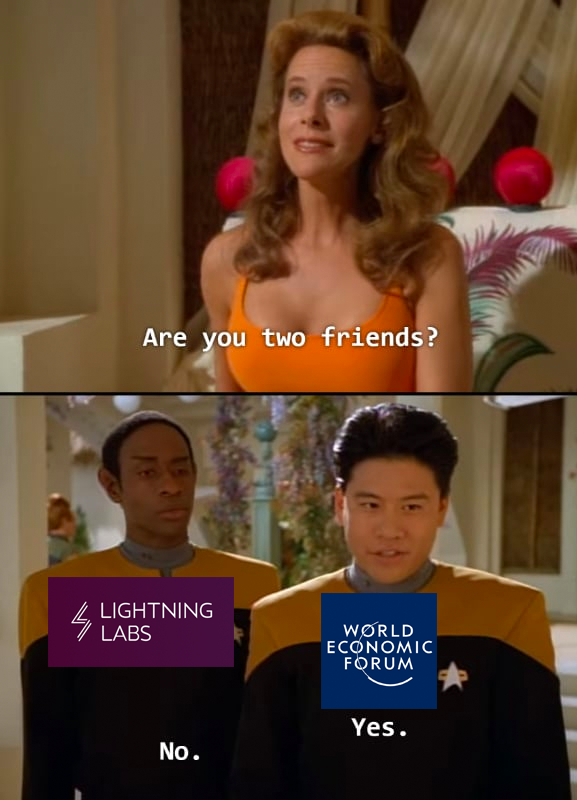 A little while back, people started pointing out links between the WEF and the ETH Foundation. People didn't like them being so close. They might be trying to make the LN look bad. Or maybe just a "we love bitcoin, buy our shitcoin." Stark said their logo was used without her or Lightning Labs permission.