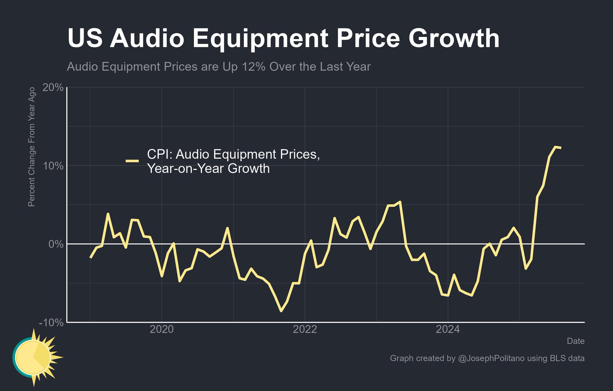 You can really see the price impact of tariffs on audio equipment like speakers, microphones, & headphones—they're some of the few electronics not exempt from tariffs (most smartphones/computers are still tariff-free) & so prices are up more than 12% year-on-year