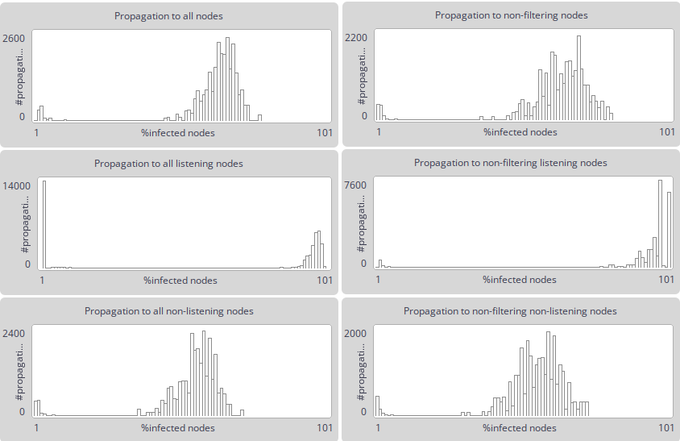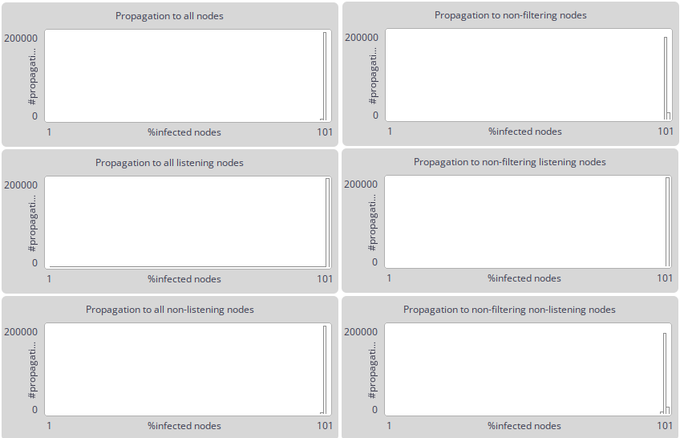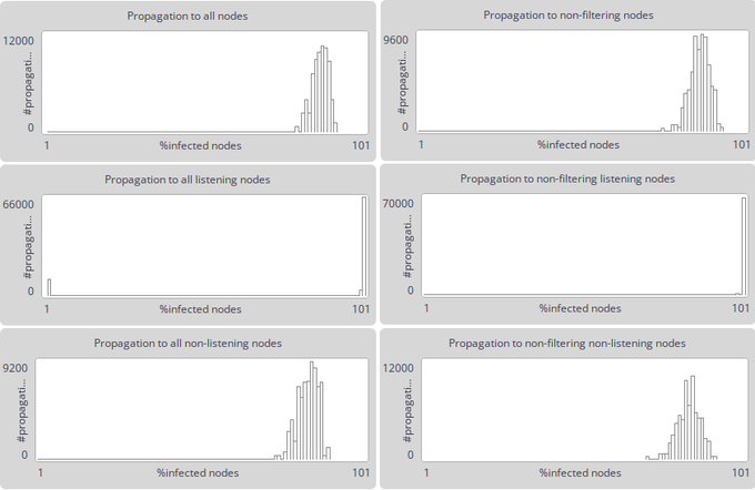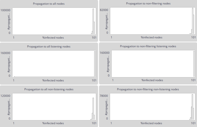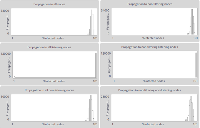 New simulation of transactions propagation on a network of 2k nodes with 20% of listening nodes.1 But this time we will monitor the propagation at a more detailed level, based on 2 criteria: the type of node and the filtering status...The idea (suggested by @Murch) is that propagation to non-filtering listening nodes will be a good proxy for evaluating how well transactions propagate to "tolerant" miners, and thus more likely to be included into a block...