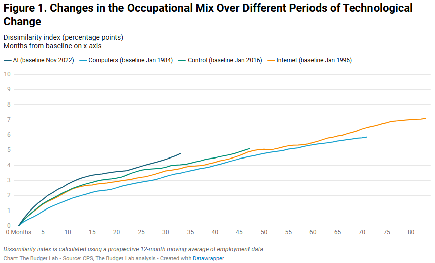 While the occupational mix is changing more quickly than it has in the past, it is not a large difference and predates the widespread introduction of AI in the workforce. Currently, measures of exposure, automation, and augmentation show no sign of being related to changes in employment or unemployment. Better data is needed to fully understand the impact of AI on the labor market. We plan on updating this analysis regularly moving forward to see how the impact of AI on the labor market changes over time.How has AI impacted the labor market? Since generative AI was first introduced nearly three years ago, surveys show widespread public anxiety about AI’s potential for job losses. While it is impossible to accurately predict the future, we can examine how U.S. employment has changed since ChatGPT’s release in November 2022.Our analysis complements other recent studies that provide nascent evidence of possible AI impacts on specific occupations and sub-populations, such as early career workers. We took a broader lens, widening the aperture to the whole labor market, and asked two main questions.[...]Is this Time Different? Changes in the Occupational Mix