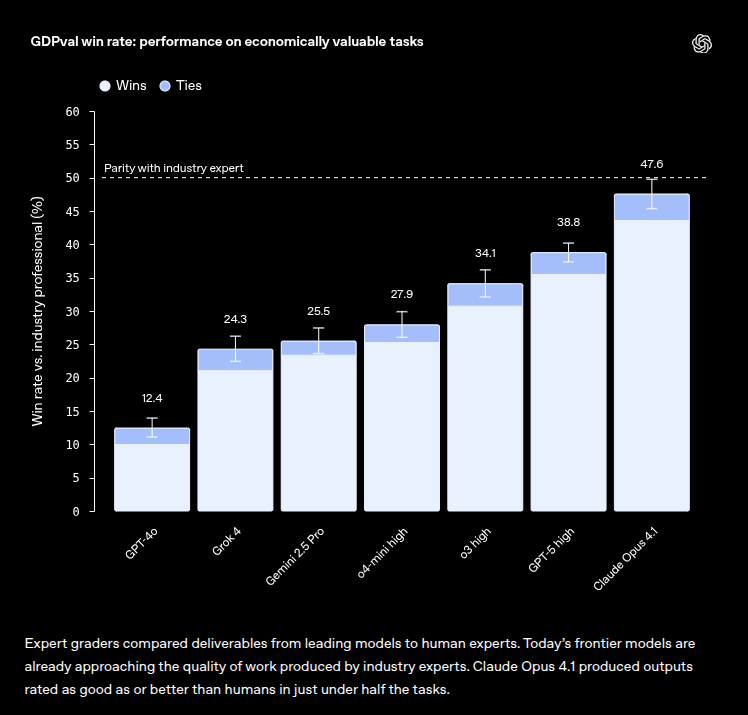 we ran blind evaluations where industry experts compared deliverables from several leading models—GPT‑4o, o4-mini, OpenAI o3, GPT‑5, Claude Opus 4.1, Gemini 2.5 Pro, and Grok 4—against human-produced work. Across 220 tasks in the GDPval gold set, we recorded when model outputs were rated as better than (“wins”) or on par with (“ties”) the deliverables from industry experts, as shown in the bar chart below. Claude Opus 4.1 was the best performing model in the set, excelling in particular on aesthetics (e.g., document formatting, slide layout), and GPT‑5 excelled in particular on accuracy (e.g., finding domain-specific knowledge). We also see clear progress over time on these tasks. Performance has more than doubled from GPT‑4o (released spring 2024) to GPT‑5 (released summer 2025), following a clear linear trend.