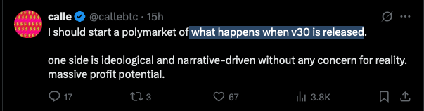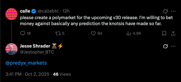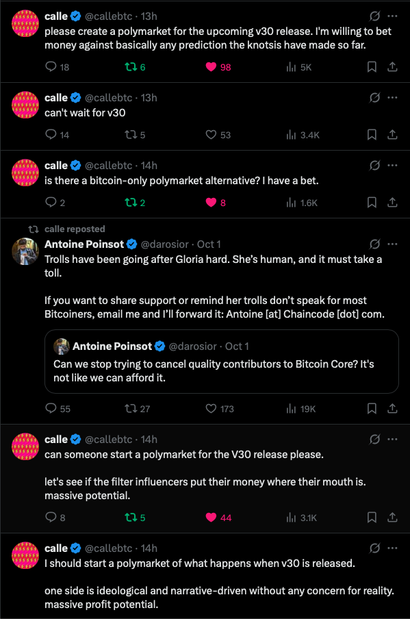 Hey Guys - based on this calle's tweet I wanted to brainstorm on various market ideas for the above topic. Please share your thoughts and ideas for the Core v30 vs Knots markets.