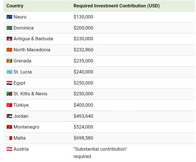 At the top end, Malta and Montenegro require close to or more than $500,000, while Austria demands a “substantial contribution,” often exceeding several million.