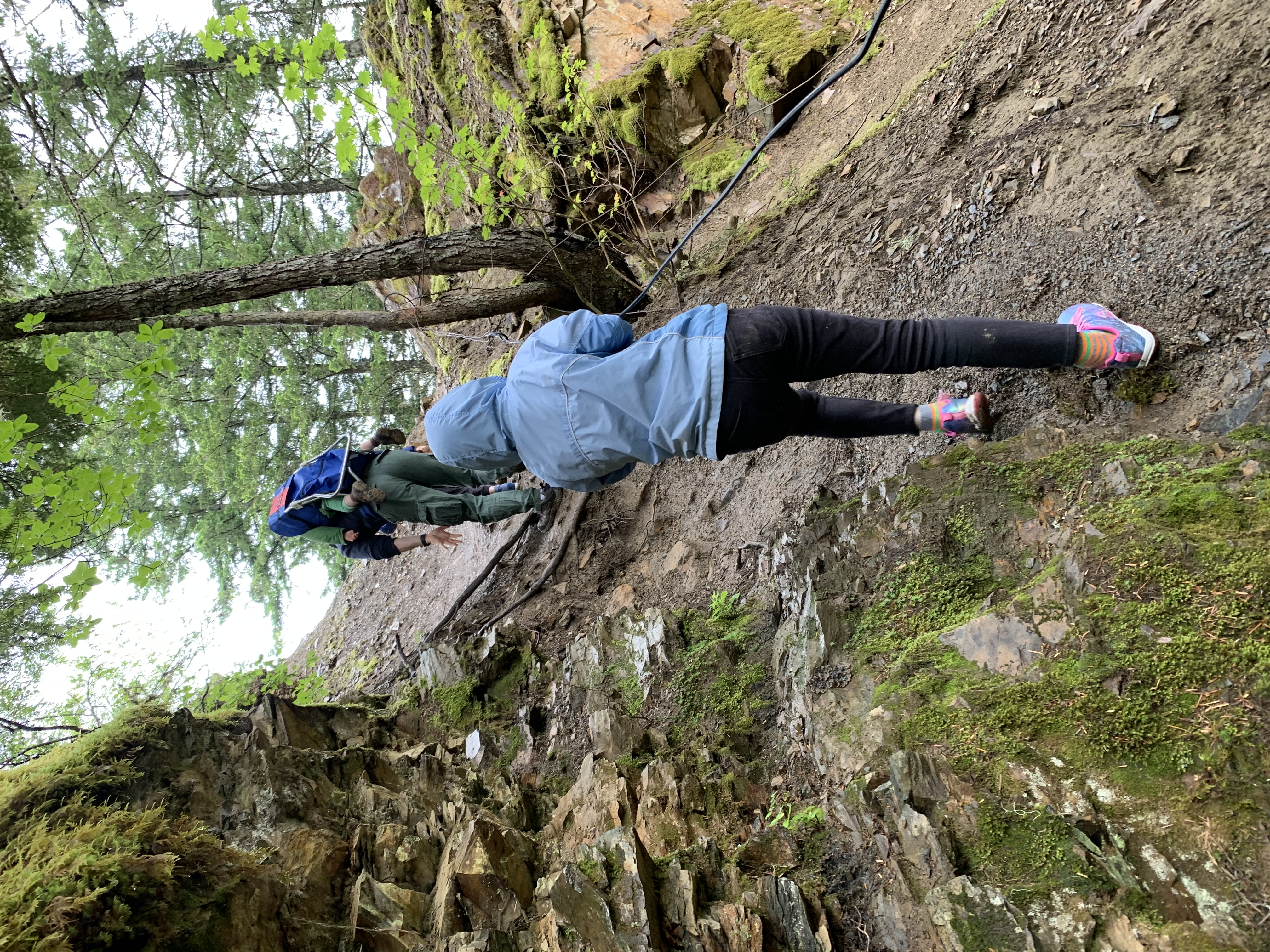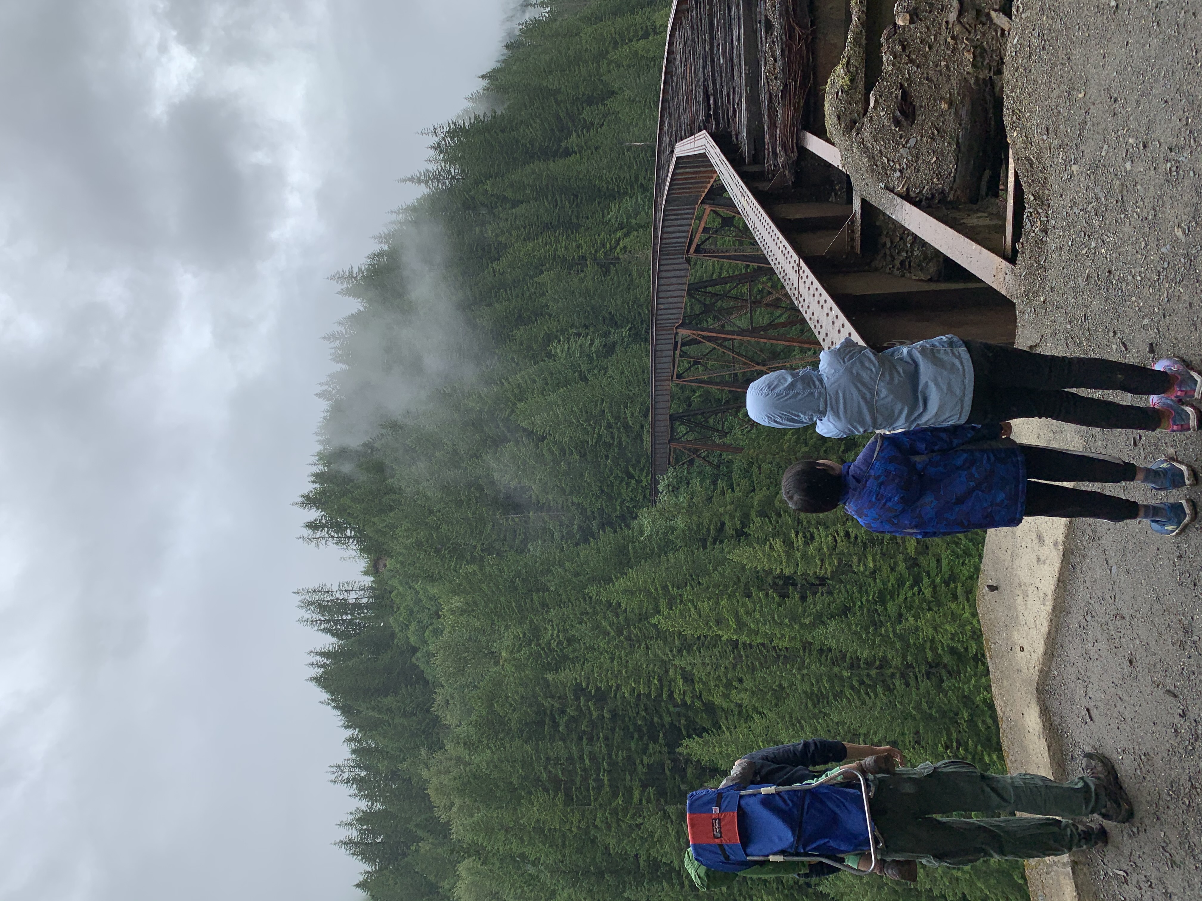 More dangerous going down. My daughter patiently waits as I help my son down the slope. They were both wearing running shoes, so they needed my help going down. Trestle in sight.
