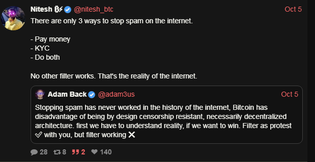 This sidesteps the real issue. Bitcoin is hard to change, so policy should move slowly, carefully, and with the community. Even Adam said he would not have merged this so fast and preferred 160B over 100 kB. The process created an unnecessary sense of urgency. Whether spam can be stopped is a separate debate. The question here is how we change Bitcoin policy.