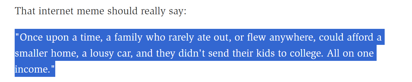 One popular meme says when baby boomers like me were young, "A family could own a home, a car, and send their kids to college, all on one income." "That's a fantasy," says economist Norbert Michel. "We are much better off than we were."