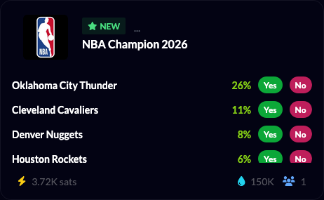 Who wins the 2026 NBA title? 🏀 Predict with sats on Predyx. Market ends July 1, 2026.
