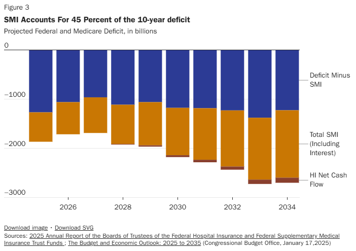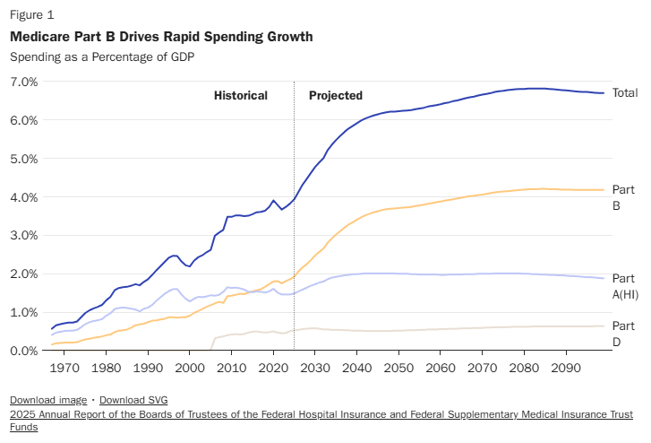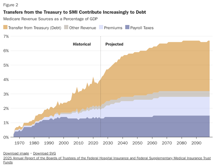 Medicare isn’t just facing a trust fund shortfall—it’s threatening America’s entire fiscal future. While headlines warn that the Hospital Insurance (HI) Trust Fund will run out in 2033, the real danger comes from a different part of the program: Supplementary Medical Insurance (SMI). SMI refers to Medicare spending by Part B (doctors’ visits and outpatient services) and Part D (prescription drugs). Unlike the HI fund, SMI is set up to take whatever it needs from taxpayers—no limits, no debate. In 2024 alone, Medicare Parts B and D financed under SMI added $498 billion straight onto the national credit card. Unless Congress makes fundamental reforms to Medicare, federal healthcare spending will drive the US toward a catastrophic fiscal crisis.The SMI “Credit Card” Problem