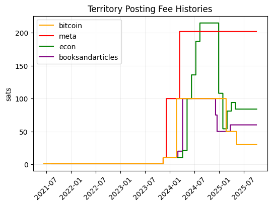 After struggling with this for a while, I think I was able to reconstruct a fairly accurate history of each territory's daily posting fees. The histories for ~bitcoin, ~meta, ~econ, and ~BooksAndArticles is shown below. I verified with their founders that the histories look accurate.