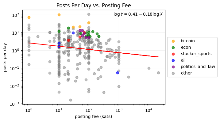 A log-log regression of the data results in the equation \log_{10} Y = 0.41 - 0.18 \log_{10} X, where Y is posts per day and X is posting fee. These numbers imply that if you 10x the posting fee in your territory, you can expect about 33% fewer posts per day. The results suggest that users are indeed sensitive to posting fee.