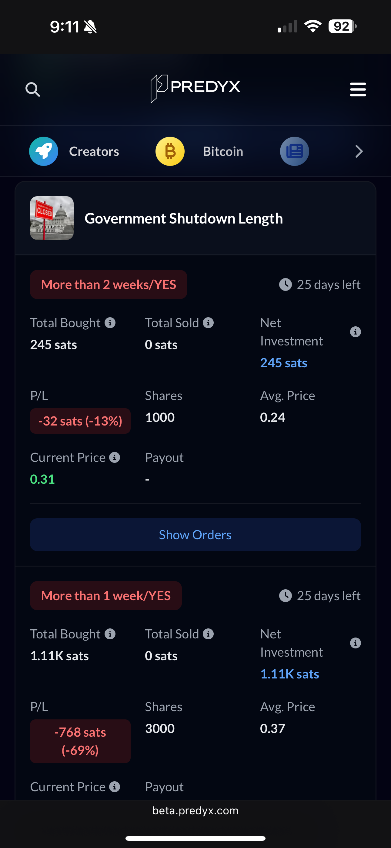 Not entirely sure what is going on here but I was reviewing how my predictions where doing and saw this below with the Government Shutdown Length Market. Given that the market was for over a week and we are now 8 days in is there a reason that it looks like I took a bloodbath in that prediction? I know it won’t settle till the government is funded again but just something that stuck out to me since it isn’t accurate.