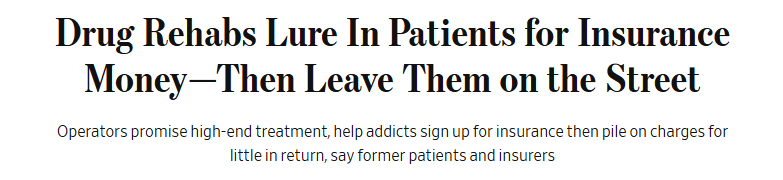 The rehabs are often in locations that people might be tempted to travel to, such as beachside cities in Florida. It’s become especially prevalent in California, where operators have discovered a steady stream of revenue by luring people with addiction from across the country and billing their private insurance. Lawsuits and federal cases allege that rehabs can charge insurance hundreds of thousands of dollars for a few months’ stay, but offer little in the way of treatment.