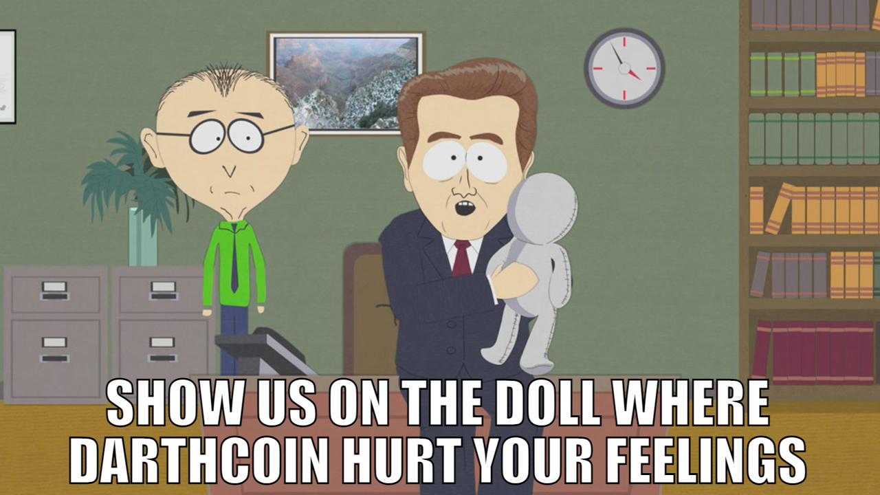 Is simple as that: can you show us where Darthcoin hurt your feelings? Nobody can answer that stupid question.