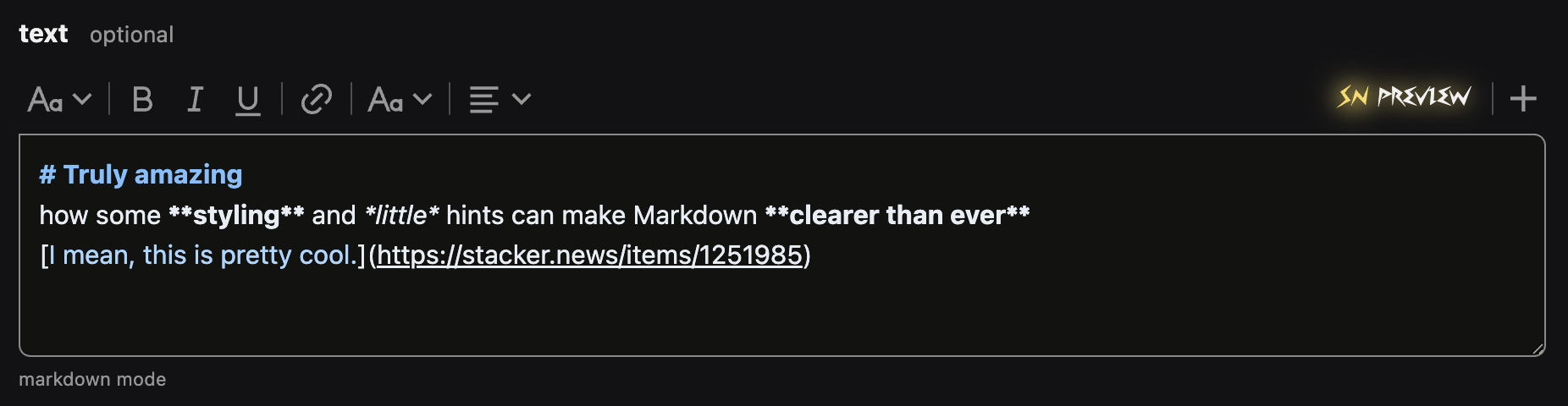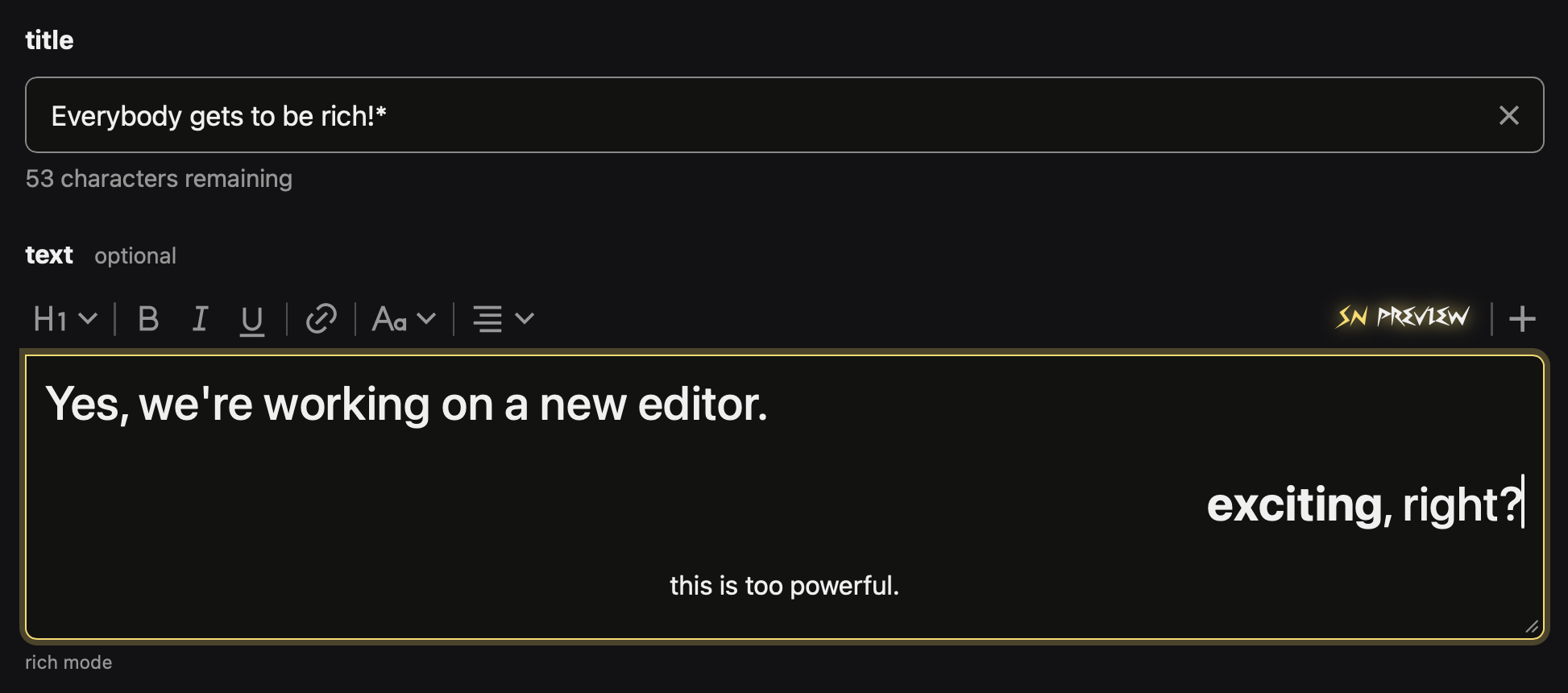 This has been a sneak peek into what's next for the writing experience on Stacker News. But the editor, a really central part of SN, has to be at least somewhat good enough for everyday use before we can let you get your hands on it.
