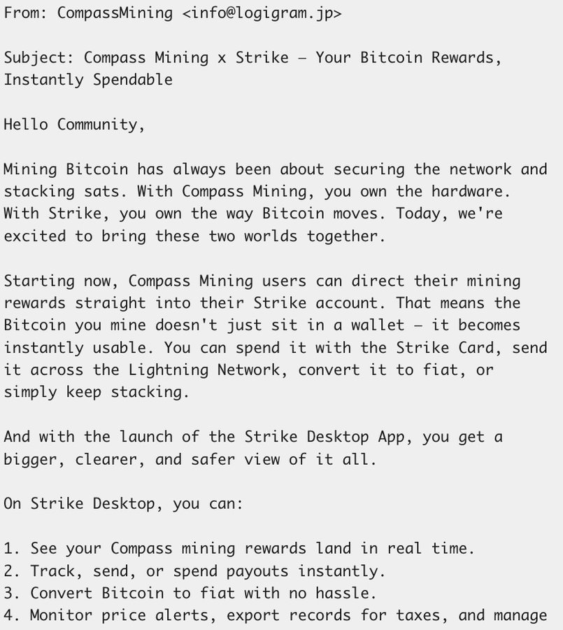 Sounds like there is a scam email going around phishing for info and claiming a Strike integration with Compass Mining. Stay on your toes! show full tweet