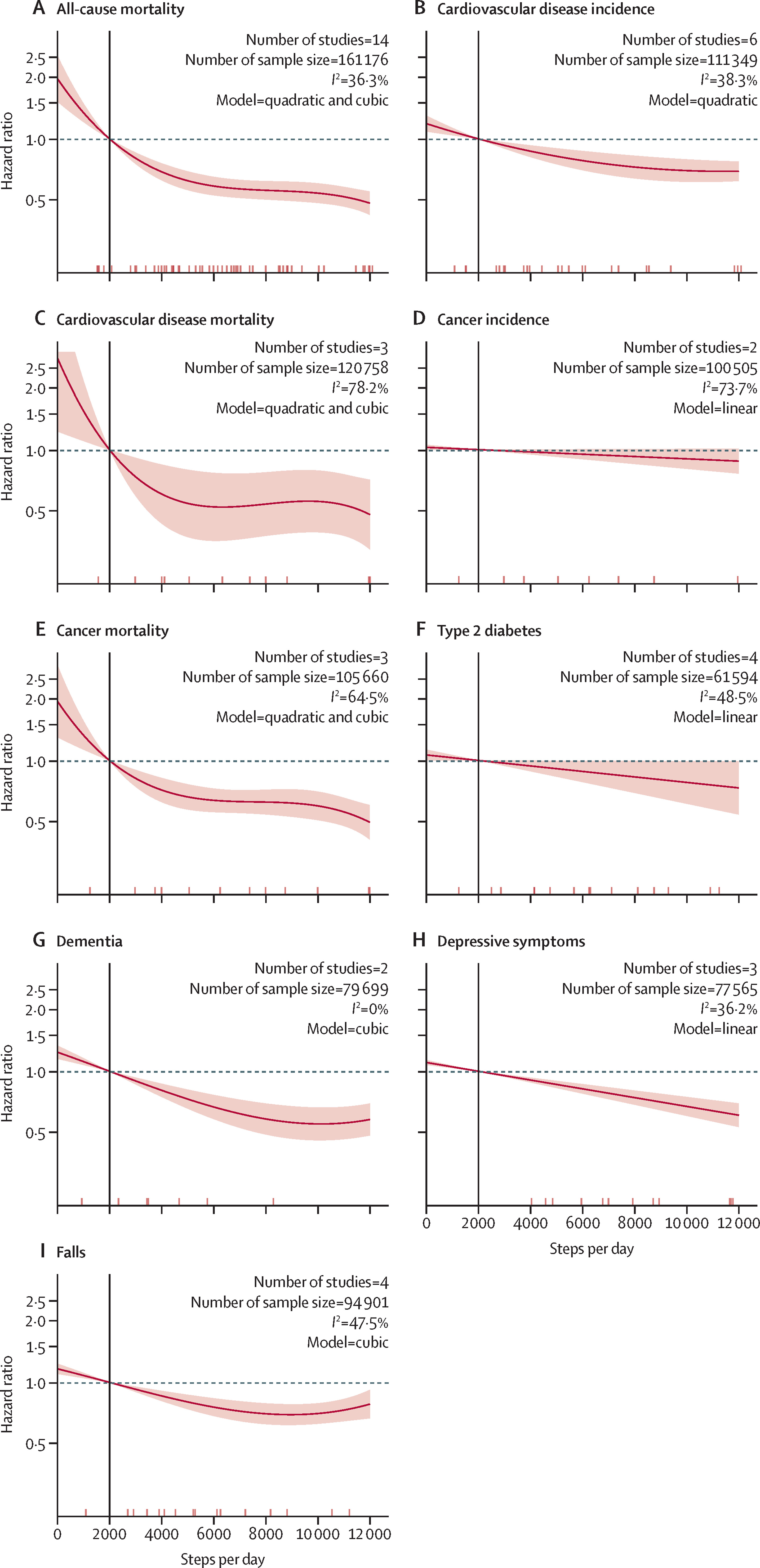 57 studies from 35 cohorts were included in the systematic review and 31 studies from 24 cohorts were included in meta-analyses. For all-cause mortality, cardiovascular disease incidence, dementia, and falls, an inverse non-linear dose-response association was found, with inflection points at around 5000–7000 steps per day. An inverse linear association was found for cardiovascular disease mortality, cancer incidence, cancer mortality, type 2 diabetes incidence, and depressive symptoms. Based on our meta-analyses, compared with 2000 steps per day, 7000 steps per day was associated with a 47% lower risk of all-cause mortality, a 25% lower risk of cardiovascular disease incidence, a 47% lower risk of cardiovascular disease mortality, a non-significant 6% lower risk of cancer incidence, a 37% lower risk of cancer mortality, a 14% lower risk of type 2 diabetes, a 38% lower risk of dementia, a 22% lower risk of depressive symptoms, and a 28% lower risk of falls. Studies on physical function (not based on meta-analysis) reported similar inverse associations. The evidence certainty was moderate for all outcomes except for cardiovascular disease mortality (low), cancer incidence (low), physical function (low), and falls (very low).