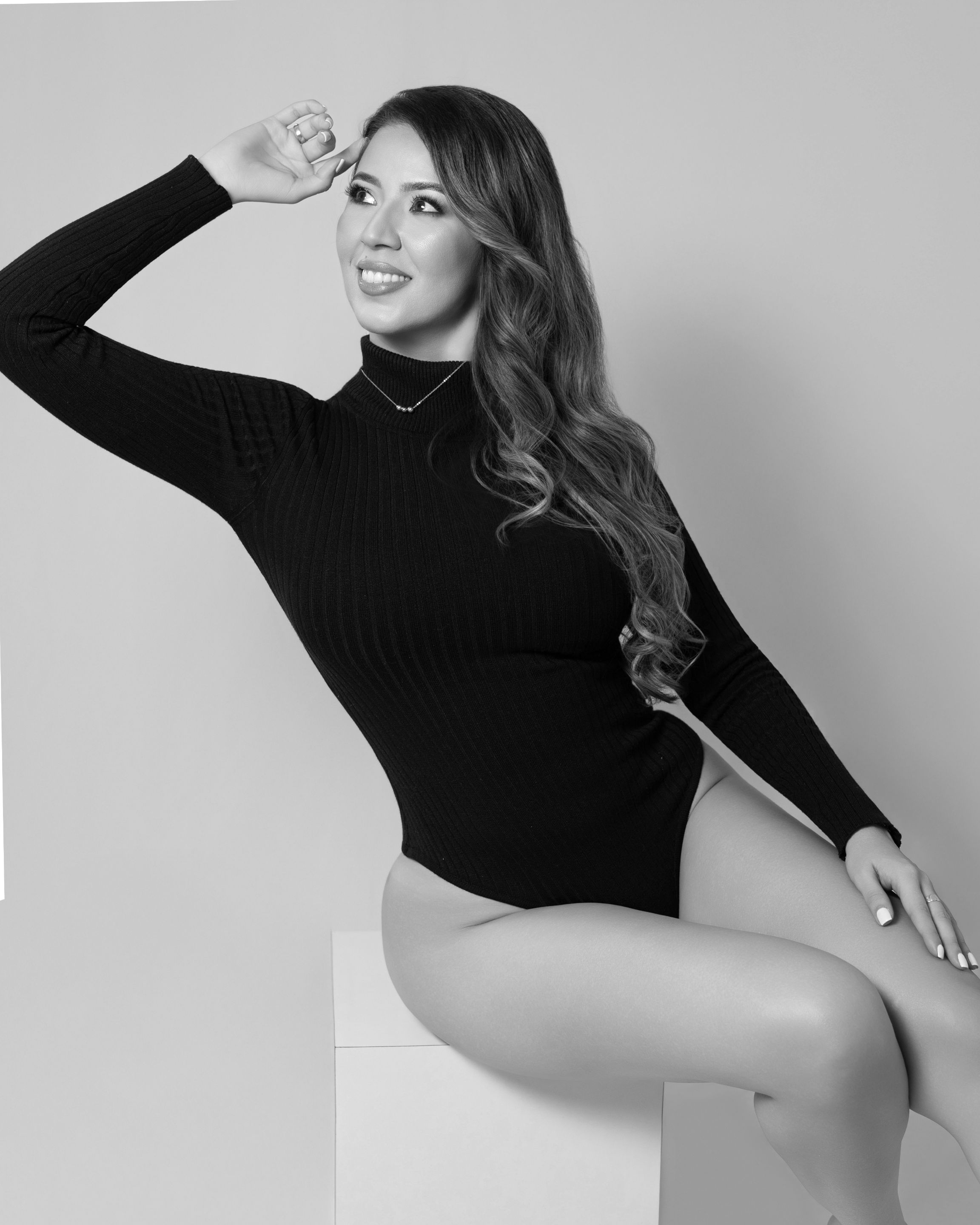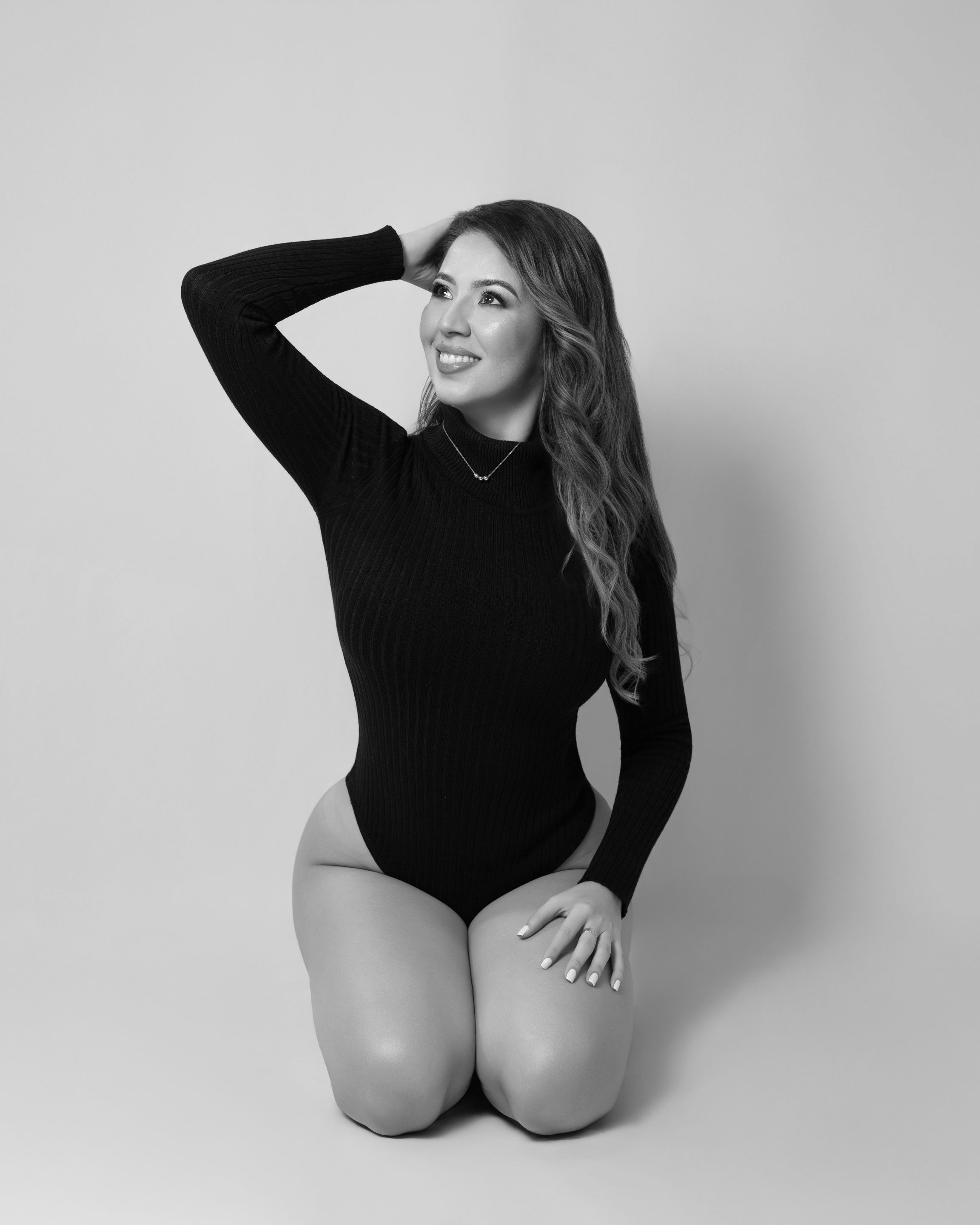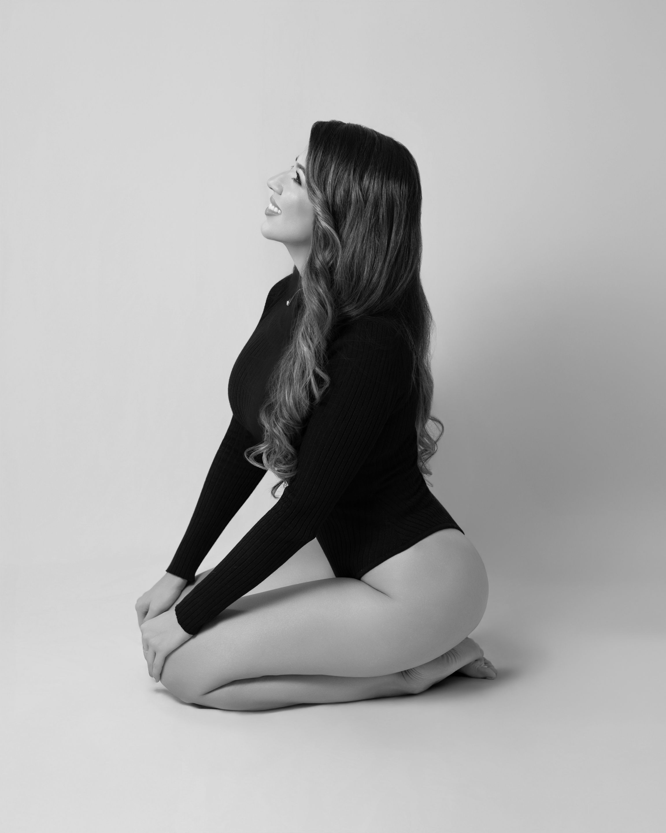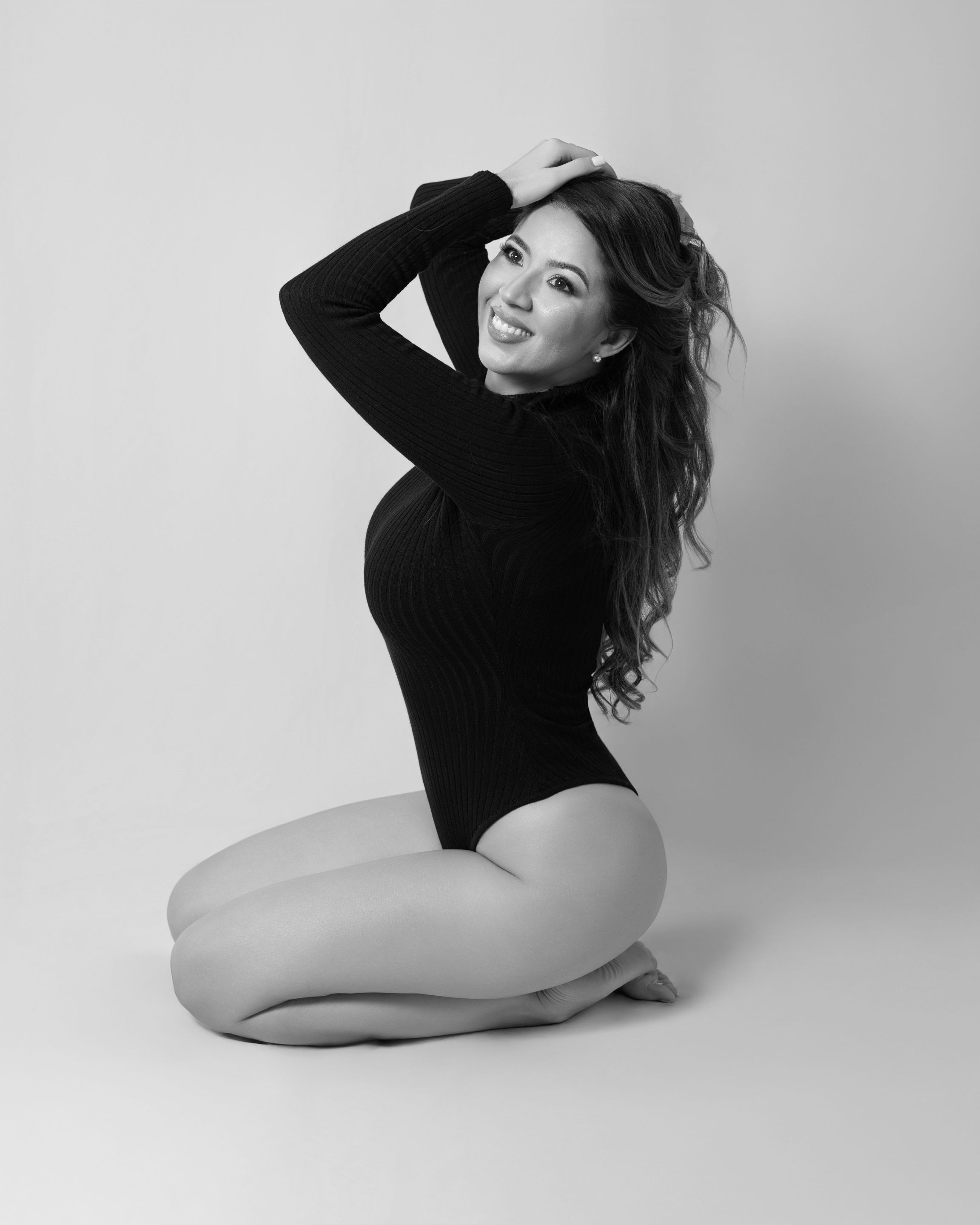 For this first part of the photography session, the girl wore a bodysuit that was perfect for accentuating her feminine figure. We started with a wide angle photographies. She did this pose because she used to be a dancer: