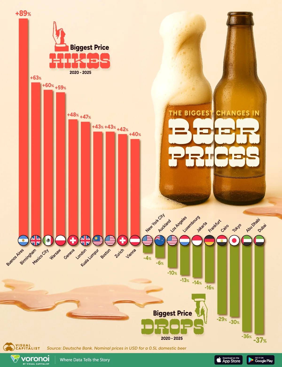 In Boston, the price of beer has shot up 43% since 2020, the fastest jump in America.Not only that, beer inflation in Boston is the eighth-highest worldwide, driven by higher ingredient and materials costs. This trend has been seen in many big cities globally, surpassing the rate of inflation.This graphic shows the cities with the steepest beer price increases and decreases in the last five years, based on data from Deutsche Bank.