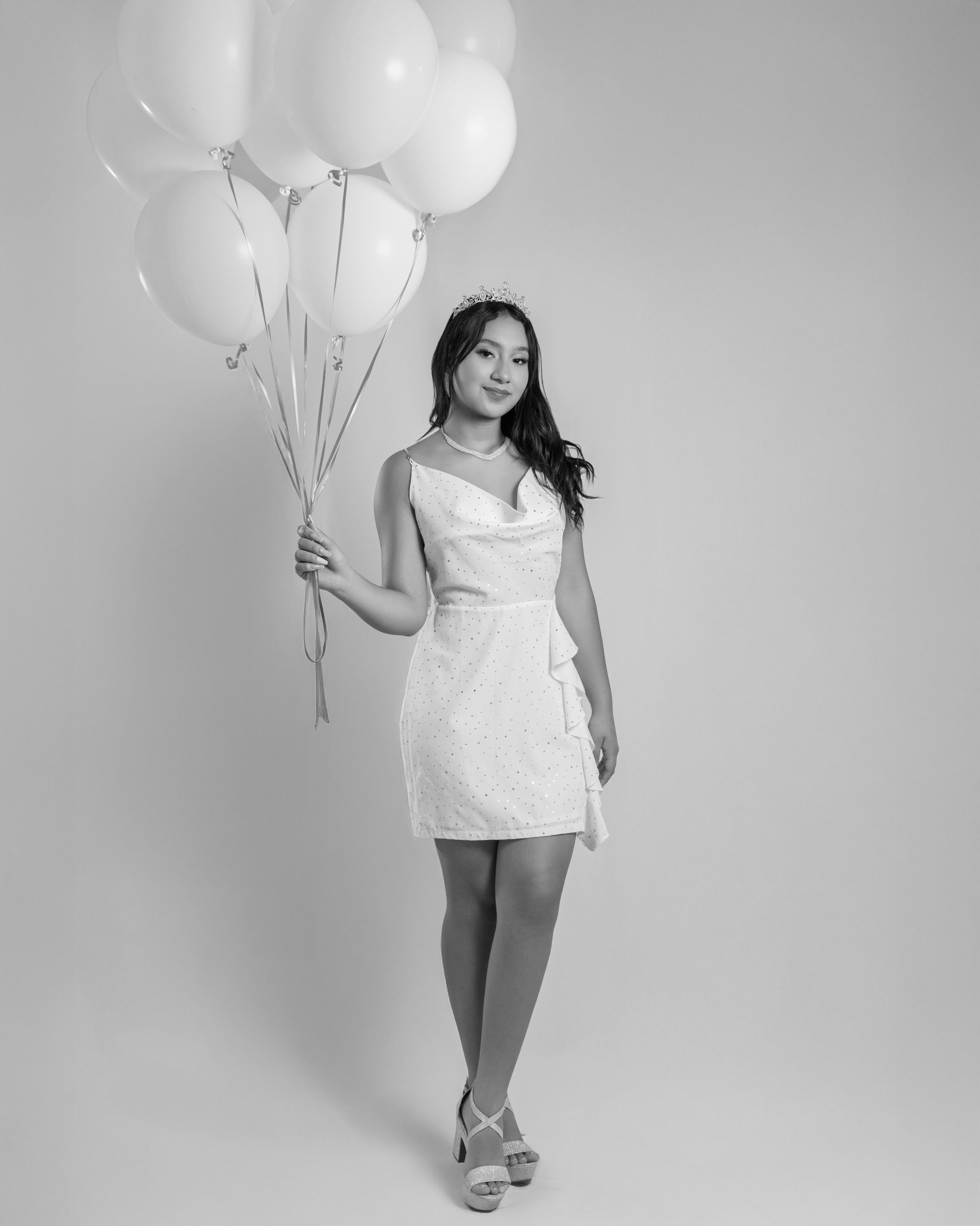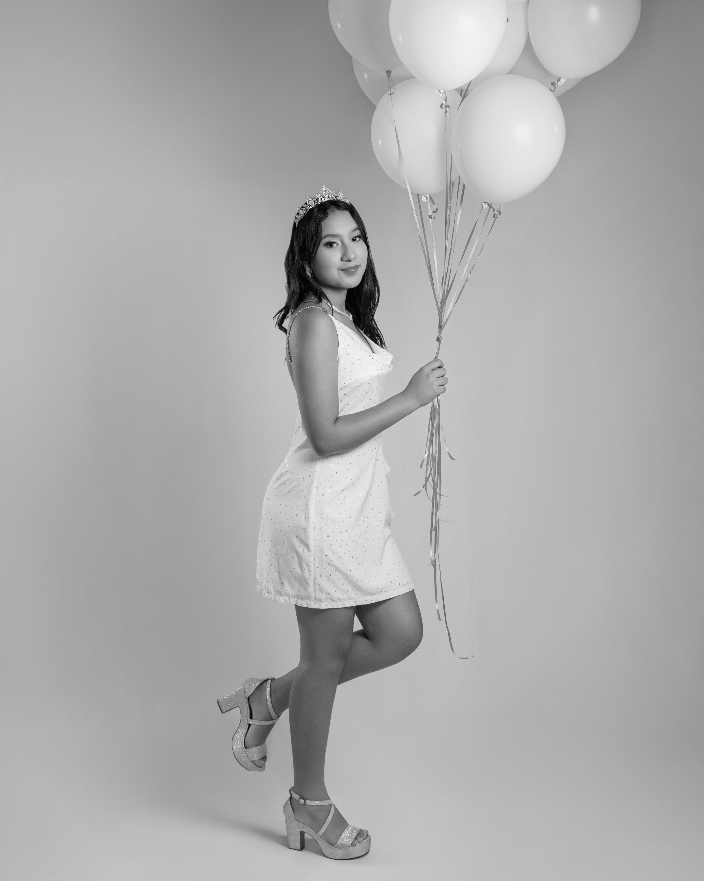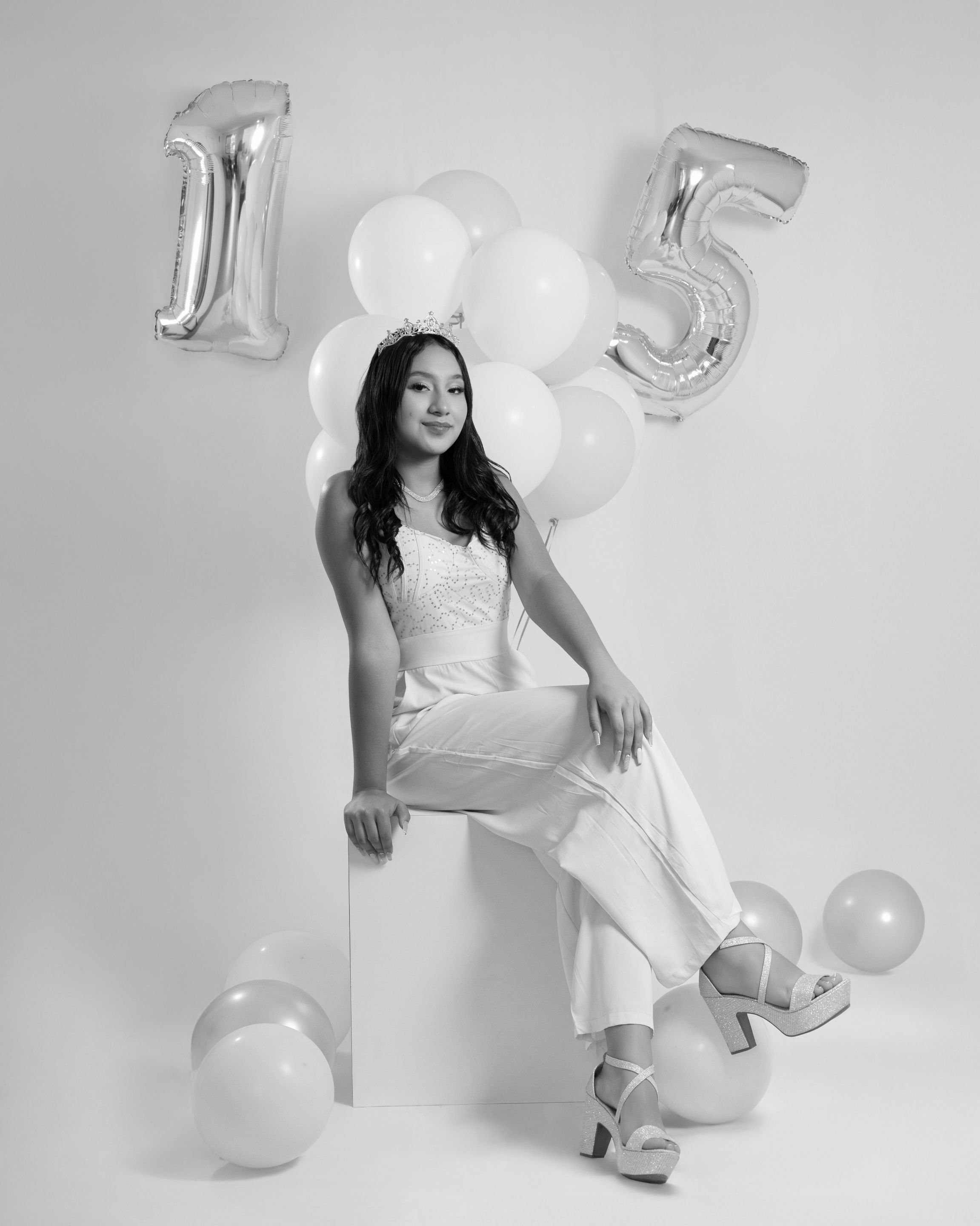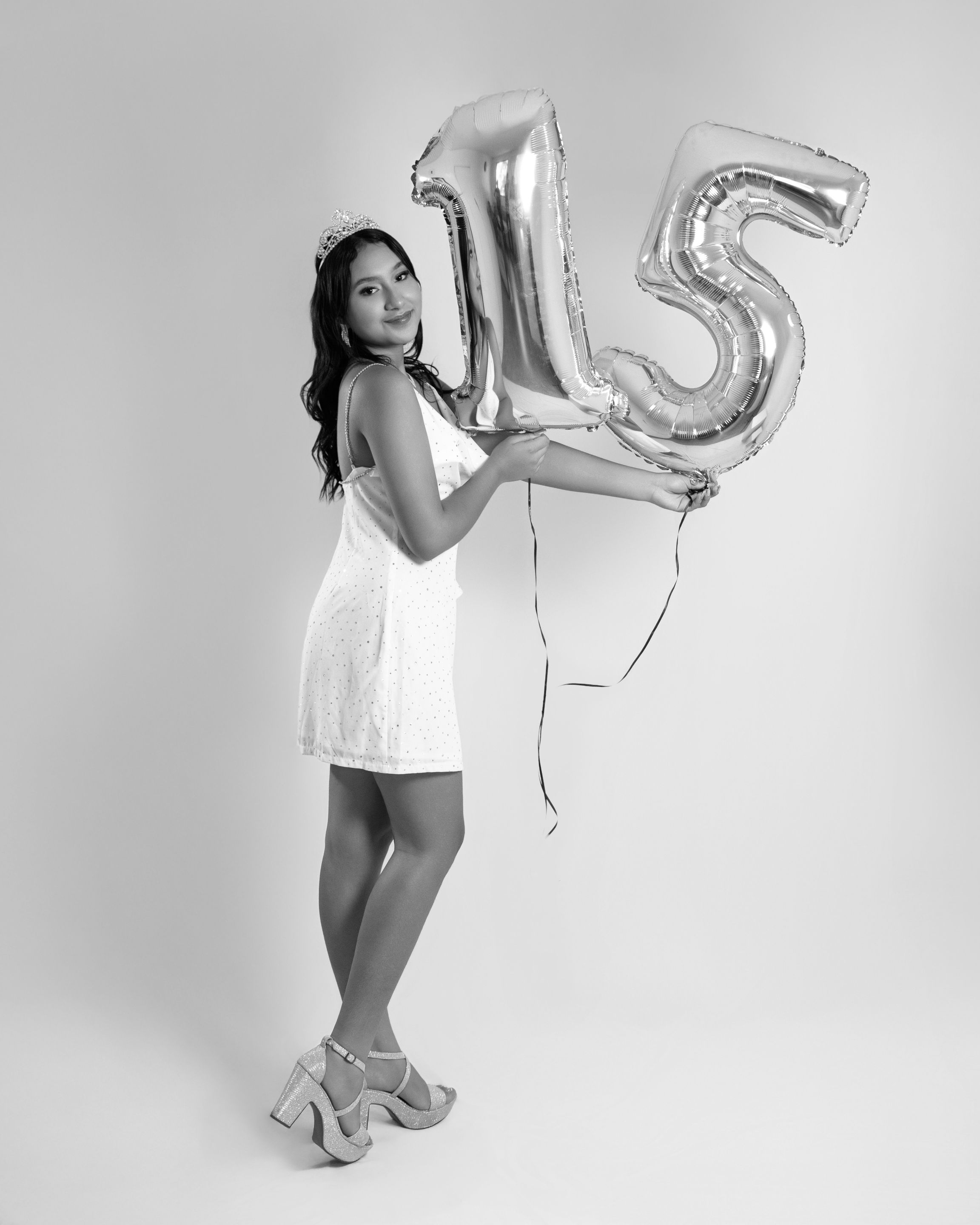 Definitely, my most recurring type of work is birthday photography sessions, so on this occasion, I want to show you some photographs I took in my studio for a quinceañera (girl celebrating her fifteenth birthday). The girl arrived at the studio accompanied by her parents, and for these photographs, they brought balloons and 3 changes of clothes.