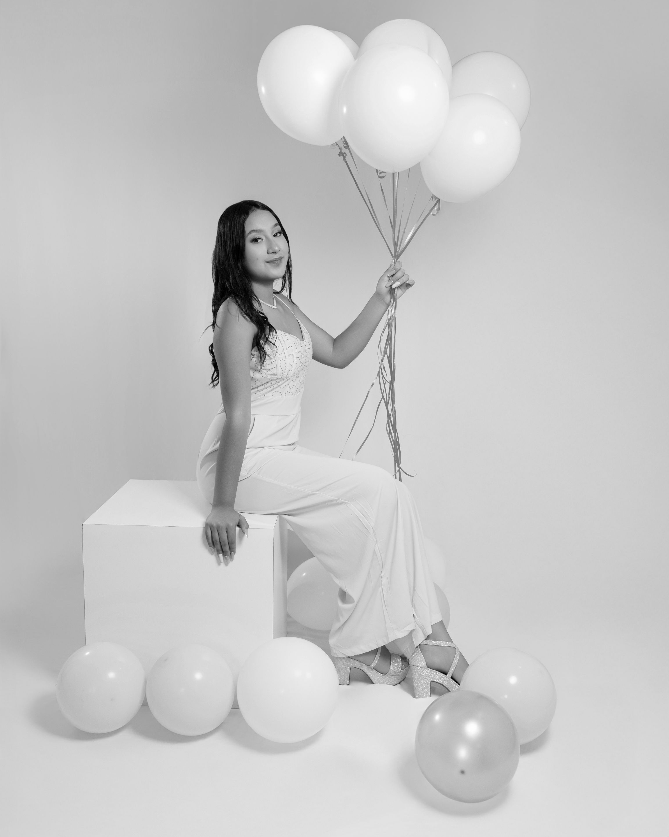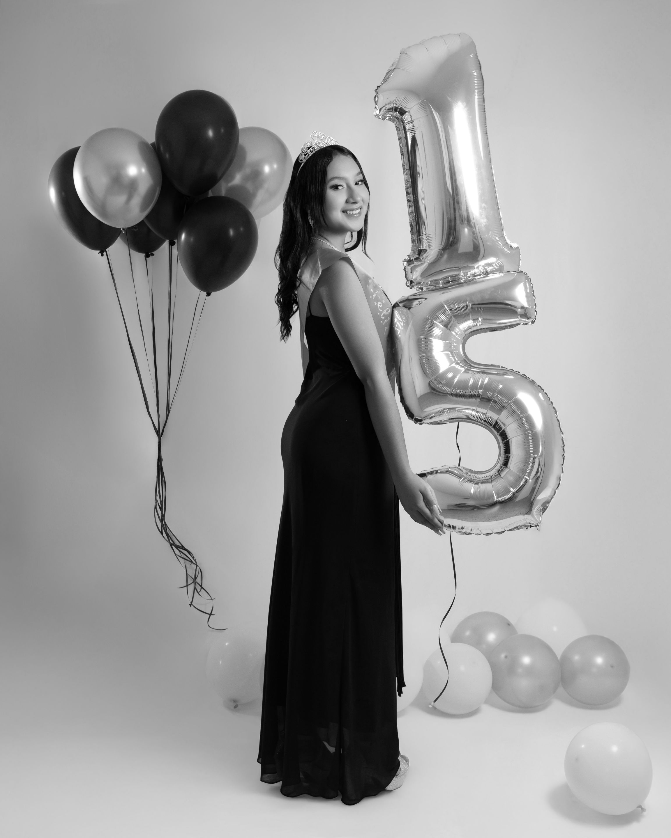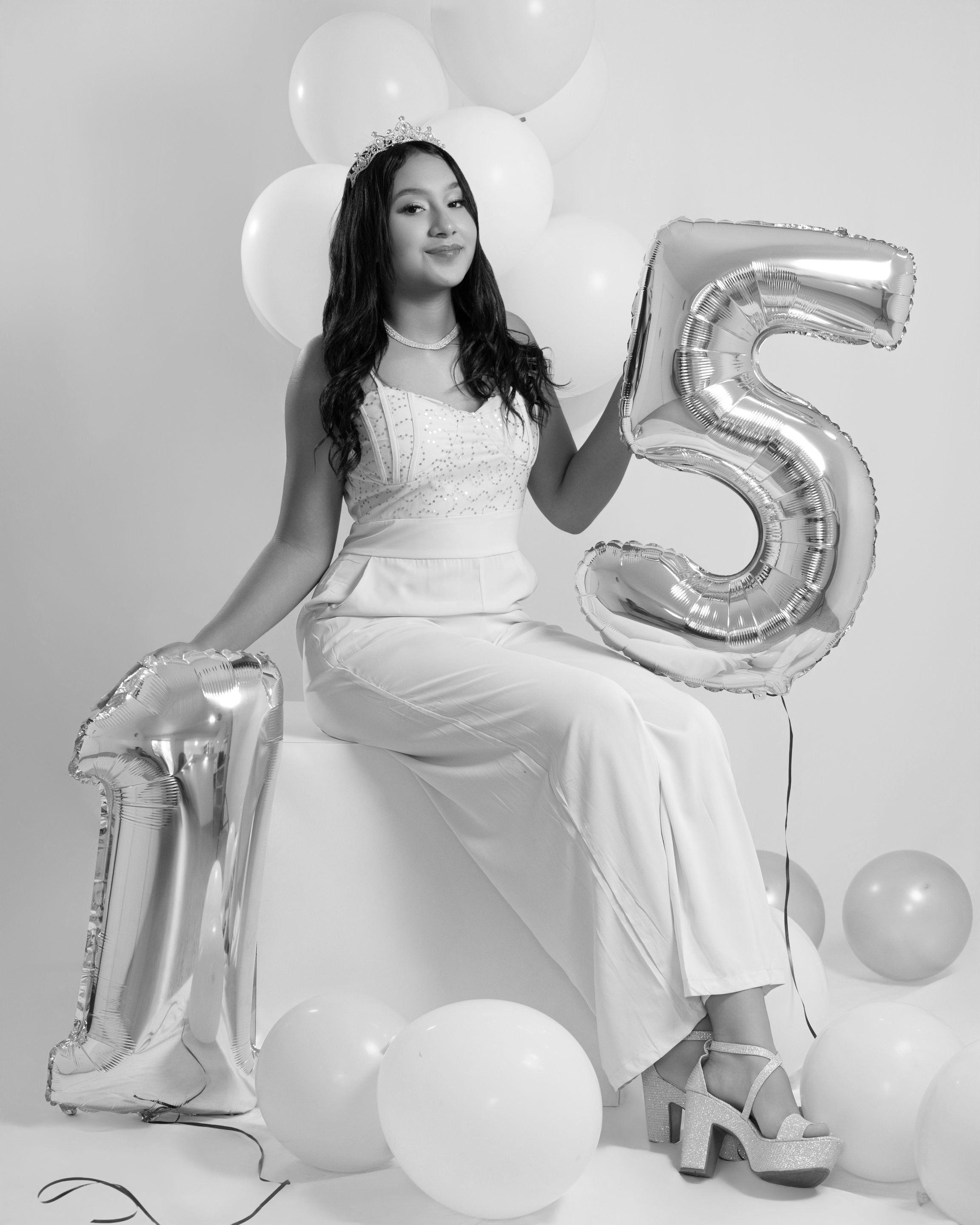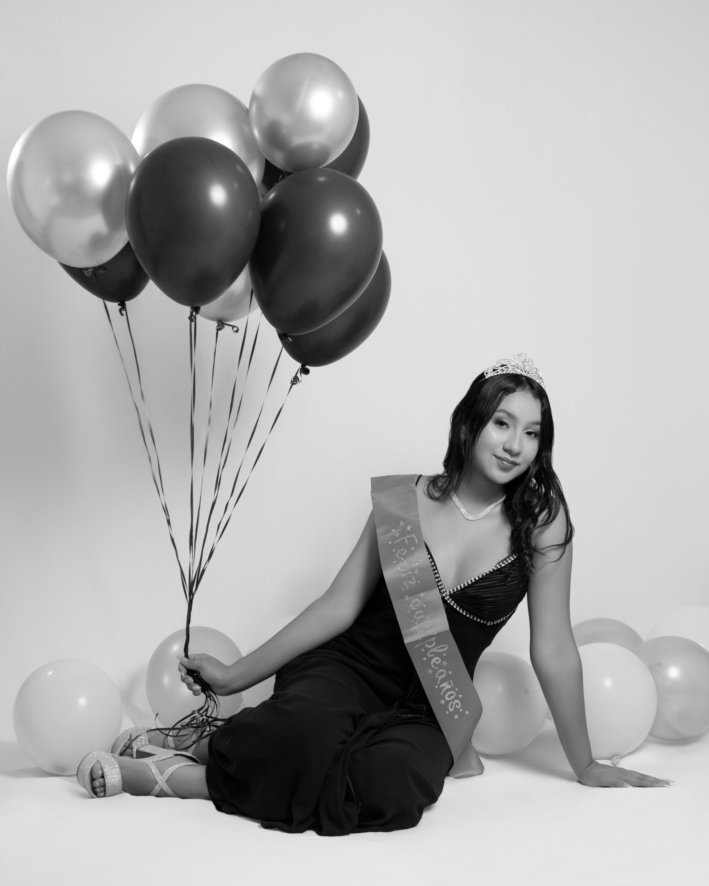 Definitely, my most recurring type of work is birthday photography sessions, so on this occasion, I want to show you some photographs I took in my studio for a quinceañera (girl celebrating her fifteenth birthday). The girl arrived at the studio accompanied by her parents, and for these photographs, they brought balloons and 3 changes of clothes.