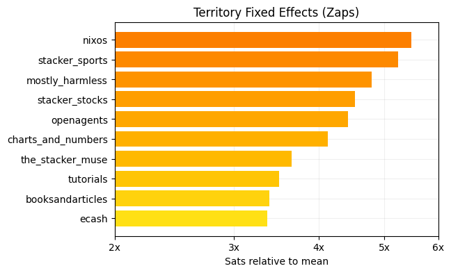 My preferred specification is actually model (3), that doesn't include user fixed effects, because isn't part of setting territory fees about related to what kinds of users you attract? The coefficient of 0.237 in model (3) implies that posts that paid double the post cost can expect to have have 18% more zaps within the first 48 hours of posting.