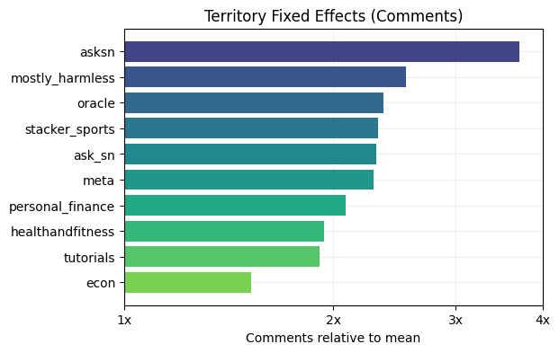 Here is a chart of the territory fixed effects for comments, so you can see which territories attract the most comments: