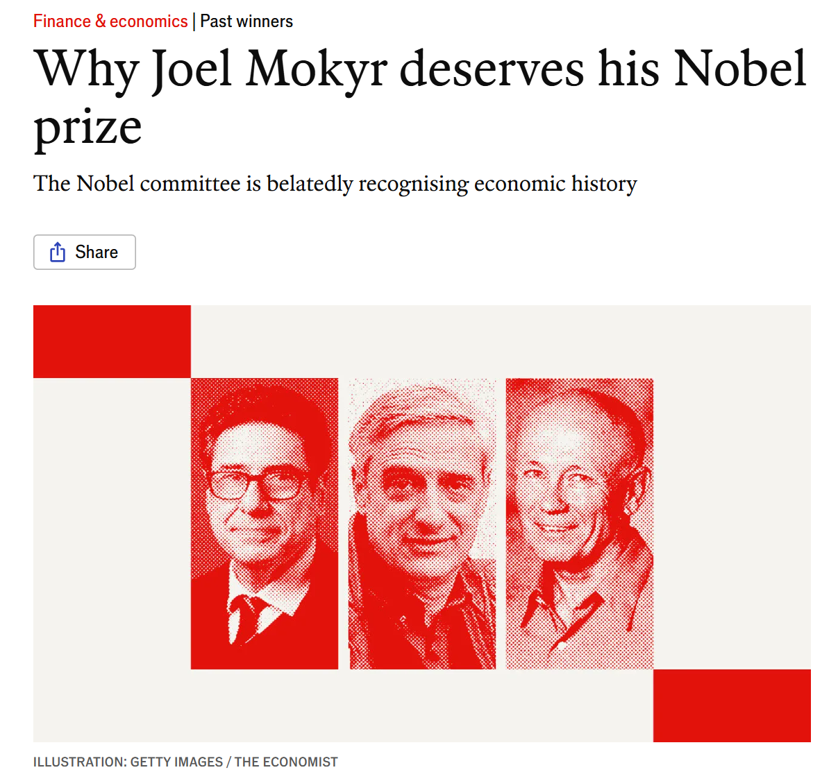 It is gratifying to see Mr Mokyr win the award. For one thing, he is a nice man who offers journalists from The Economist constructive feedback when he bumps into them at conferences.