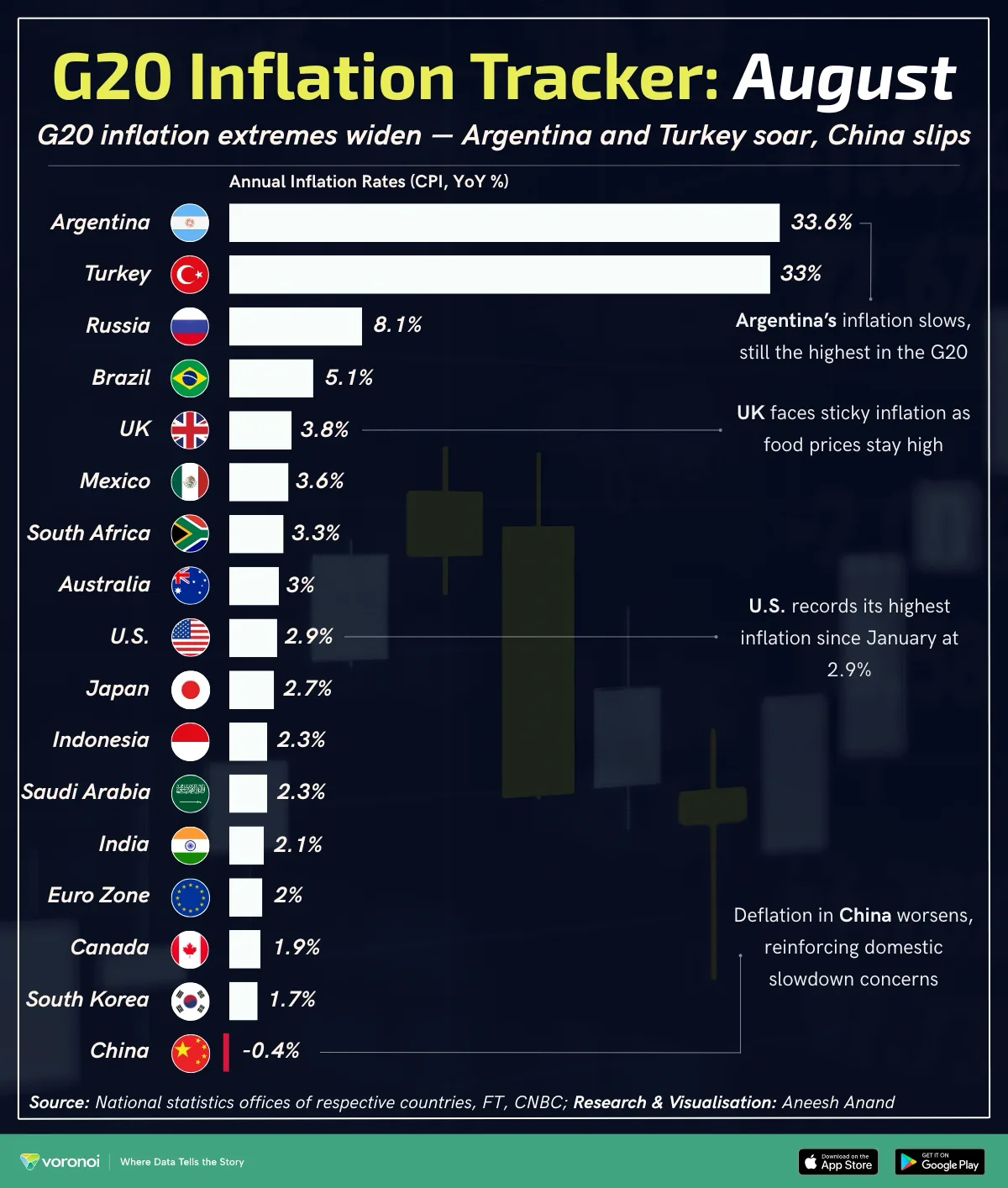Inflation remains one of the most pressing global economic issues, and this monthly G20 inflation tracker highlights the wide disparities in price growth across the world’s largest economies.Data comes from the national statistics offices of G20 countries and was visualized by Aneesh Anand. This August 2025 snapshot captures a continued divergence, with some countries still facing surging consumer prices while others battle deflation.