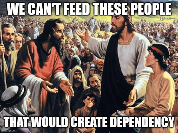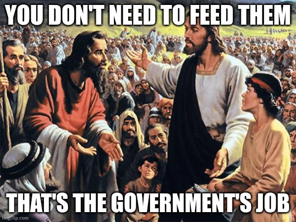 This is kinda tongue in cheek. I know that plenty of Conservative and Progressive Christians actually directly or in-directly voluntarily feed and cloth the poor. It just gets old listening to people speak in bad faith to each other when they both know they are full of it.