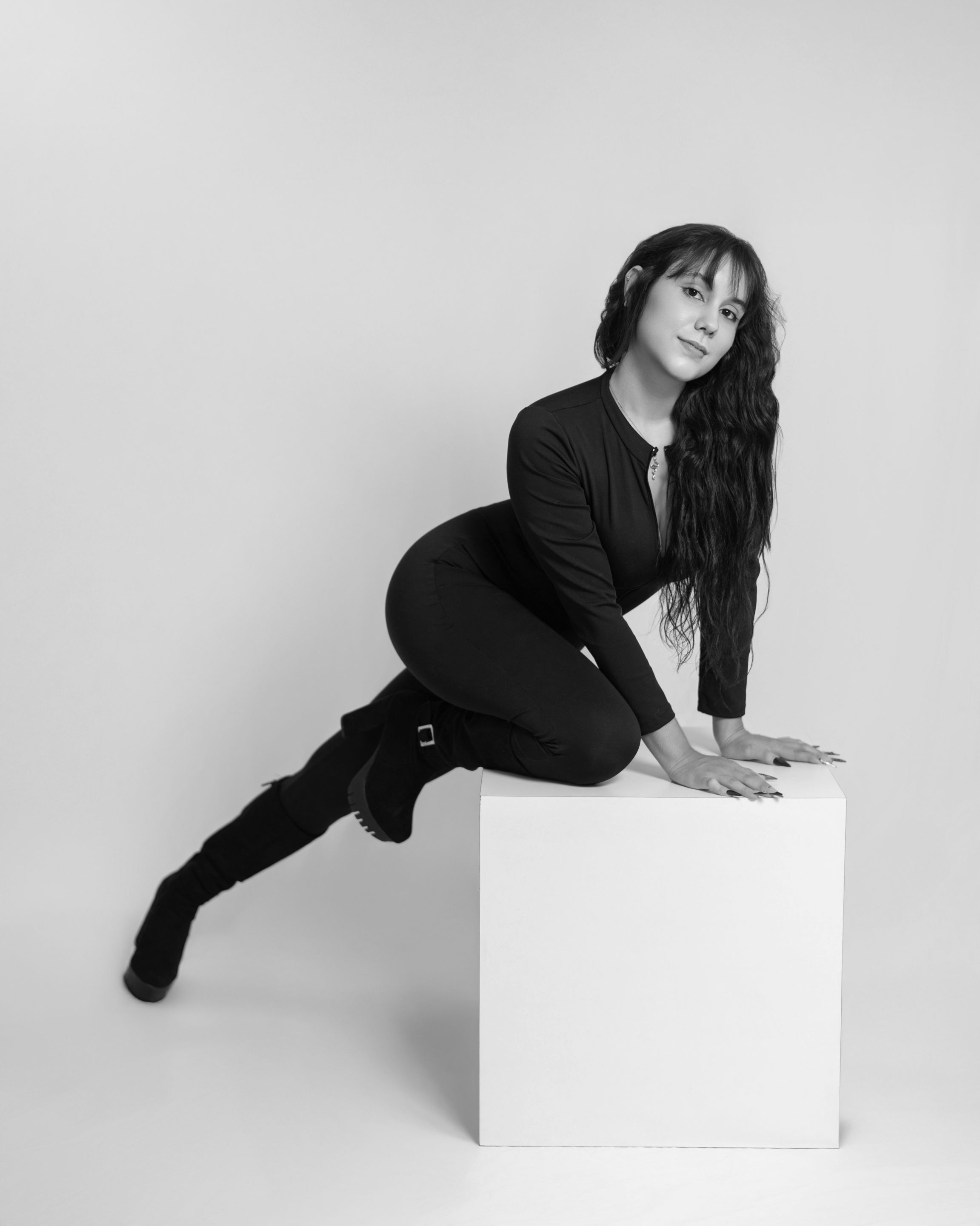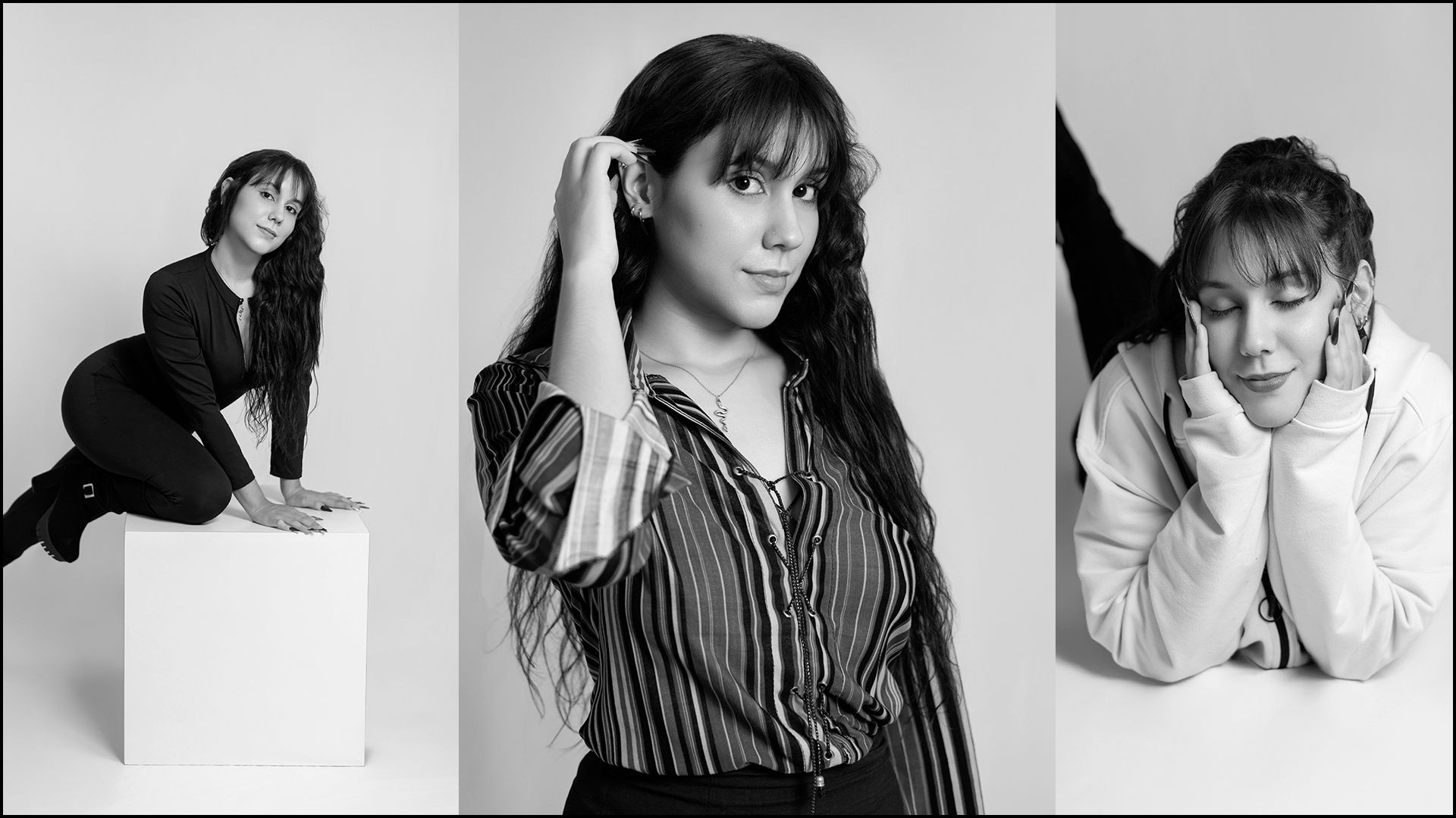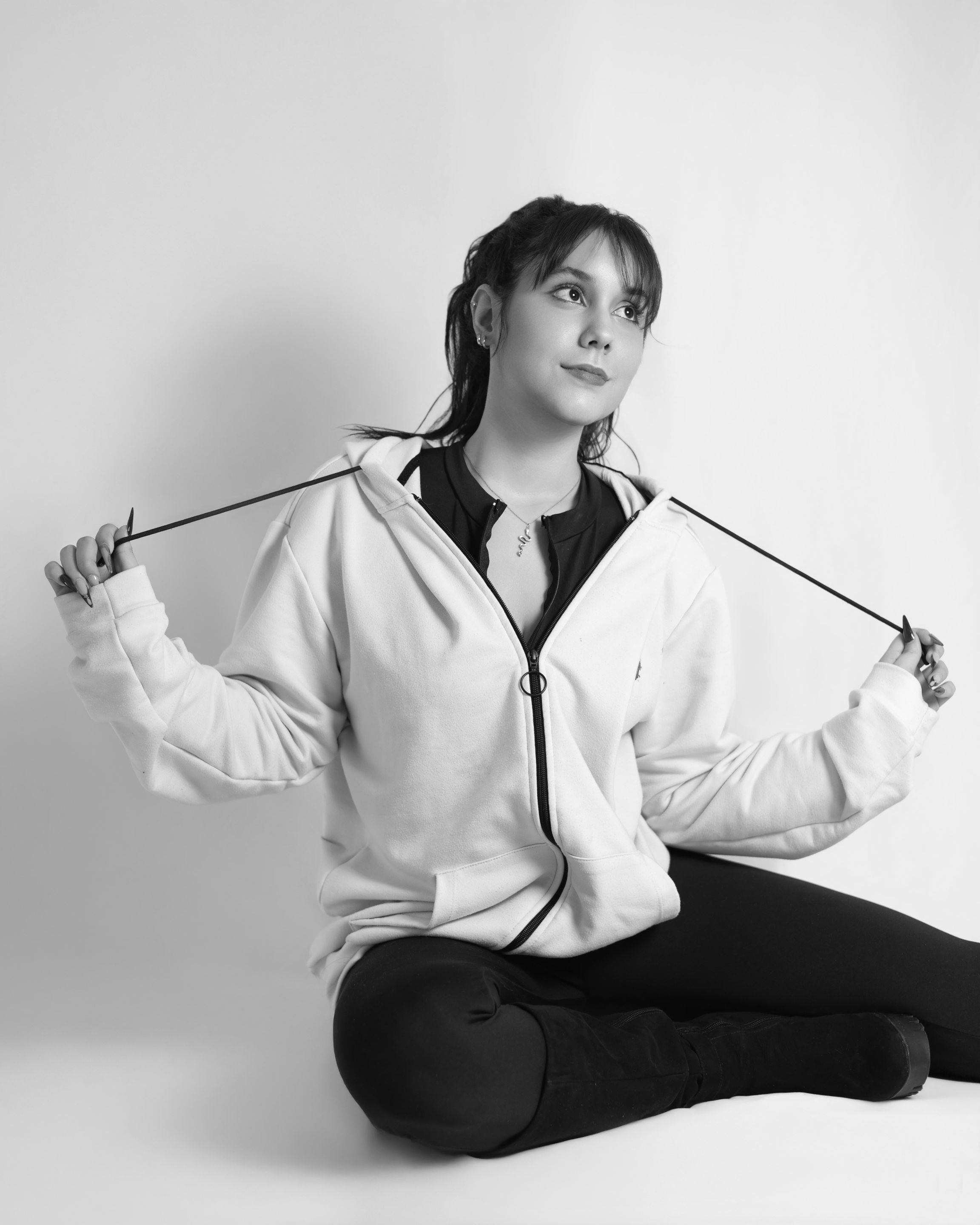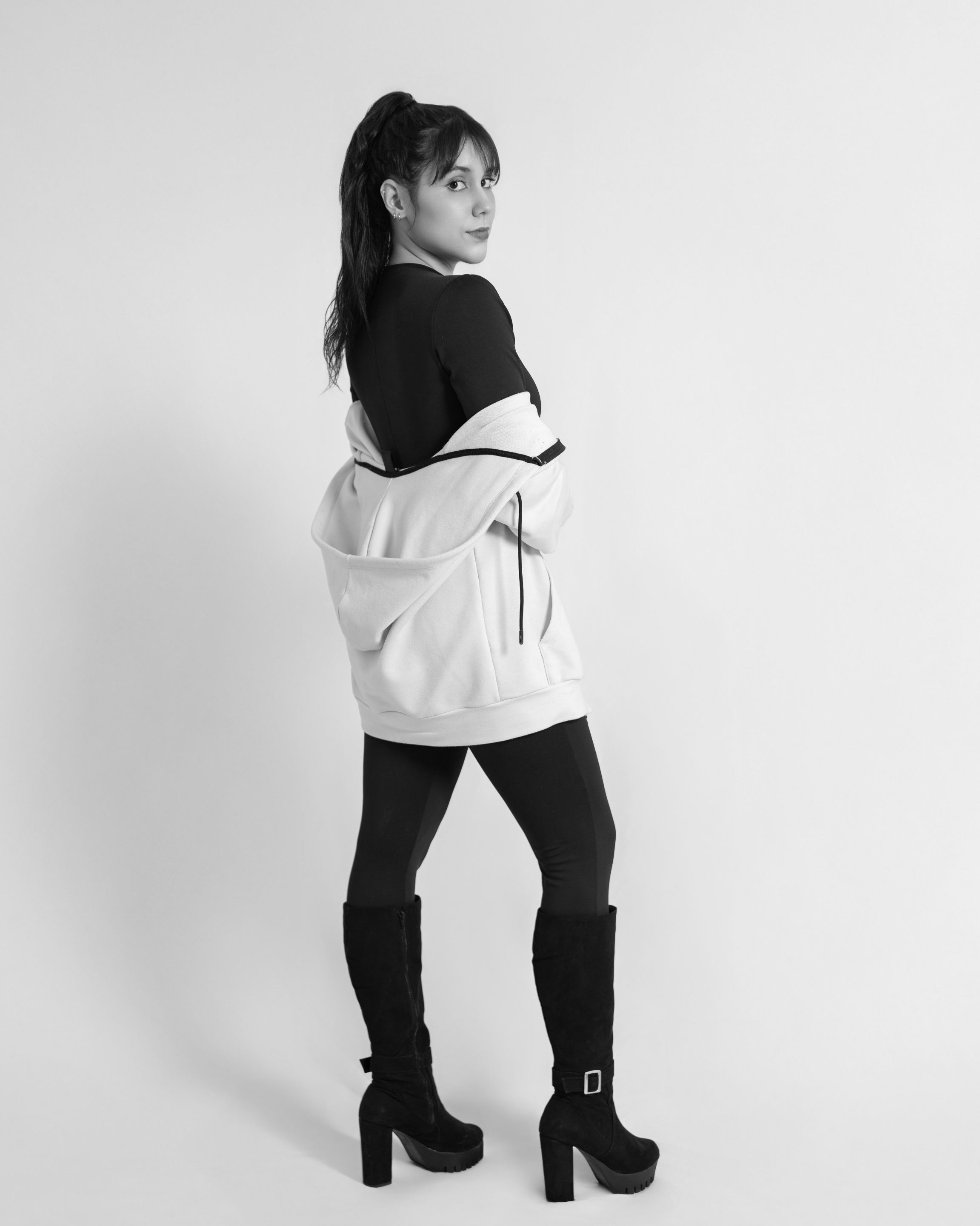 In these photographs, the girl wanted to evoke dynamism and femininity, which is why she used two completely different outfits that also highlighted her personality.
