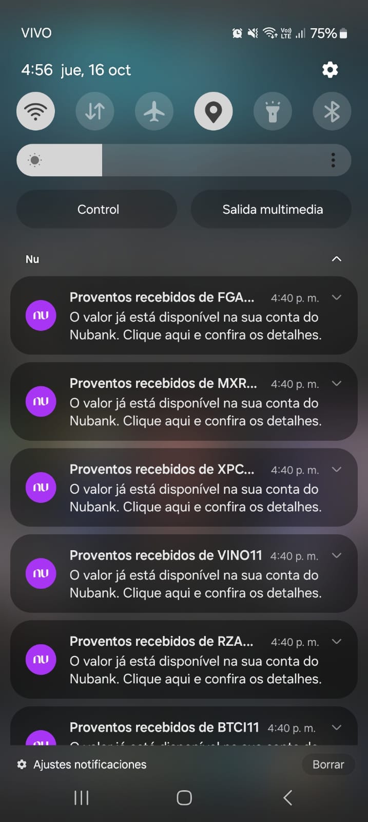 I bought some real estate funds here in Brazil, and they're giving me about 58 reais in returns, which is about $10 or $11 a month... I haven't bought anything for months now. Maybe I'll get the courage to buy some more...!!!