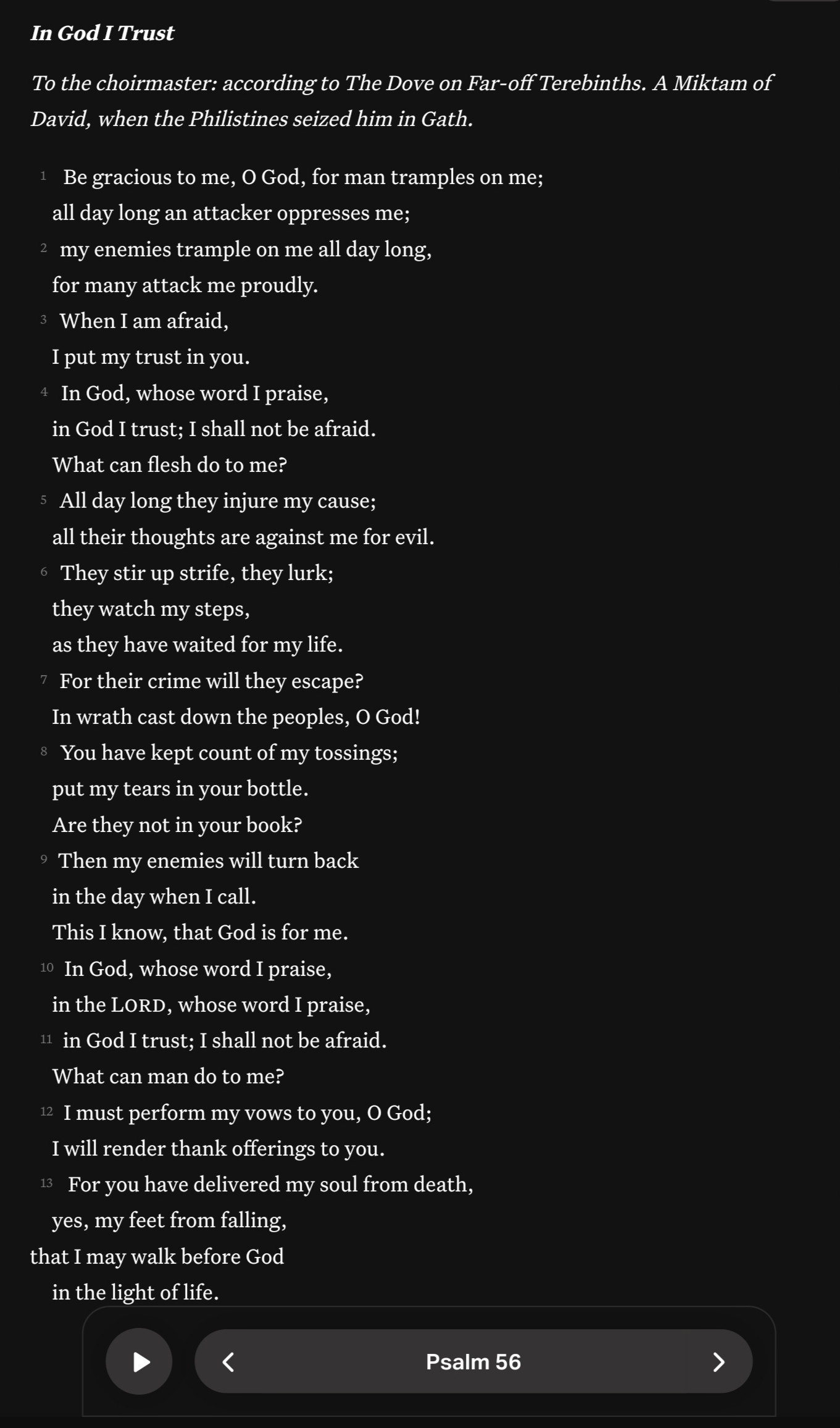 One more day of reading the Bible (all 66 books) in under one year: ✅ Today's reading: Joshua 11 Ecclesiastes 4 Psalm 56 Previously: #1257742 Day 1 (August 25, 2025): #1193991