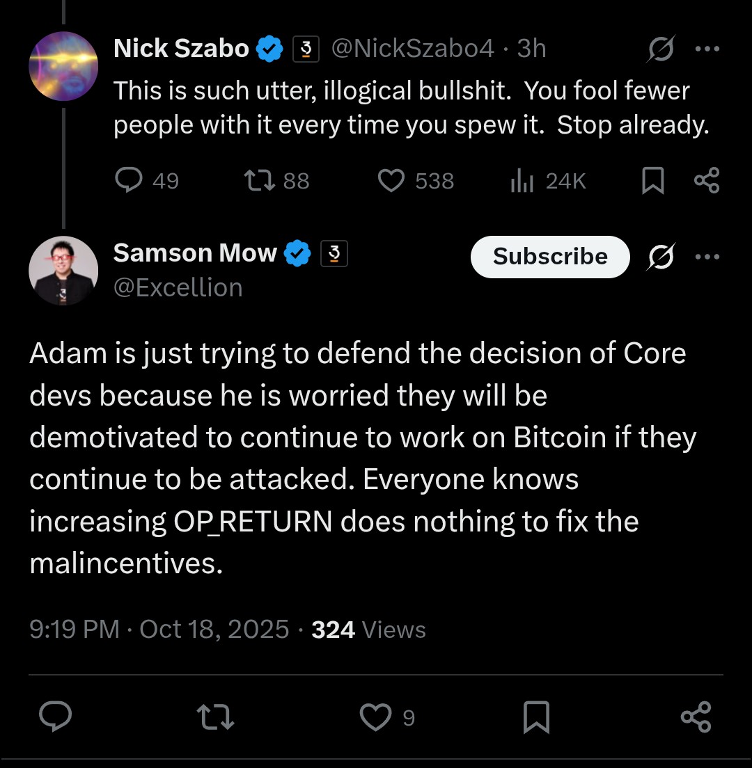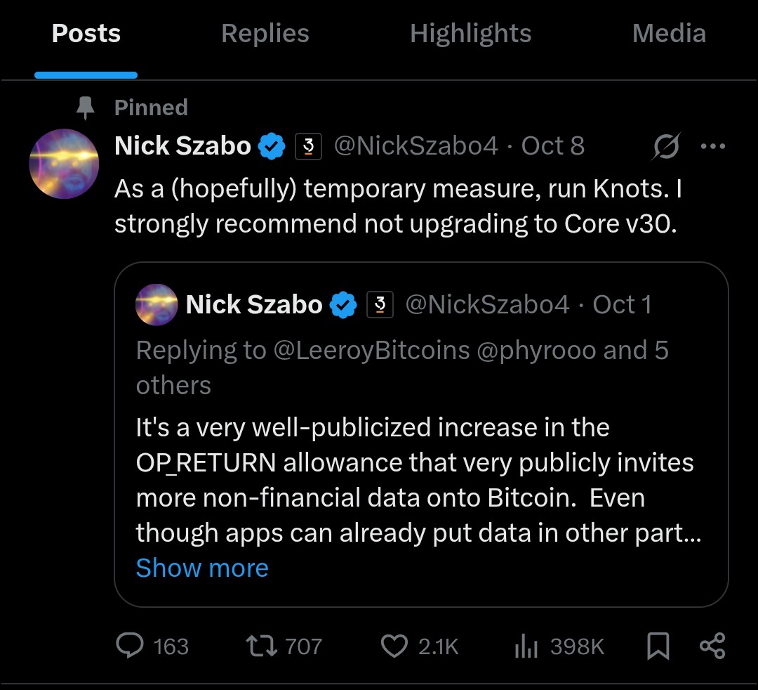 So, you may have noticed that Nick Szabo is back on Twitter (#1241258), and that he is weighing in on the Knots v Core debate (see the pinned post on his profile: