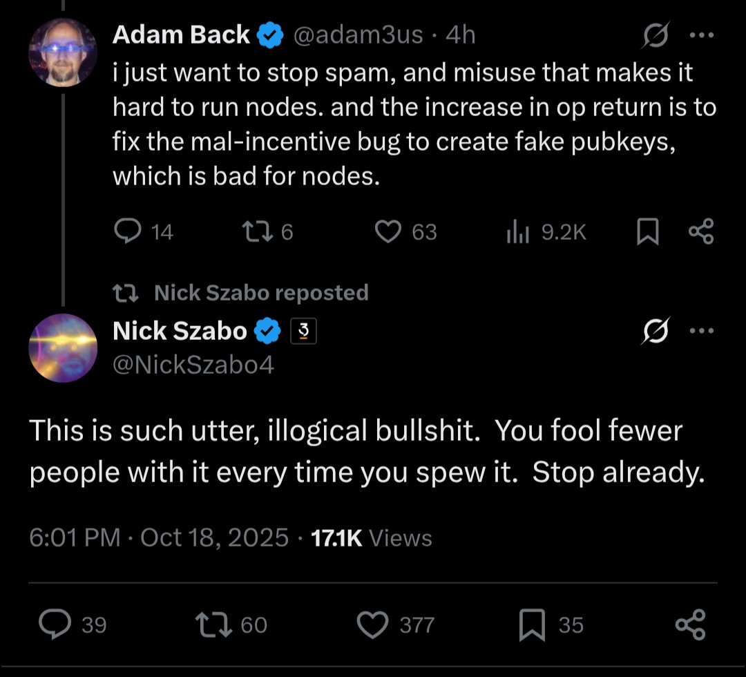 Just tonight I saw an interesting interaction between Szabo and Back: