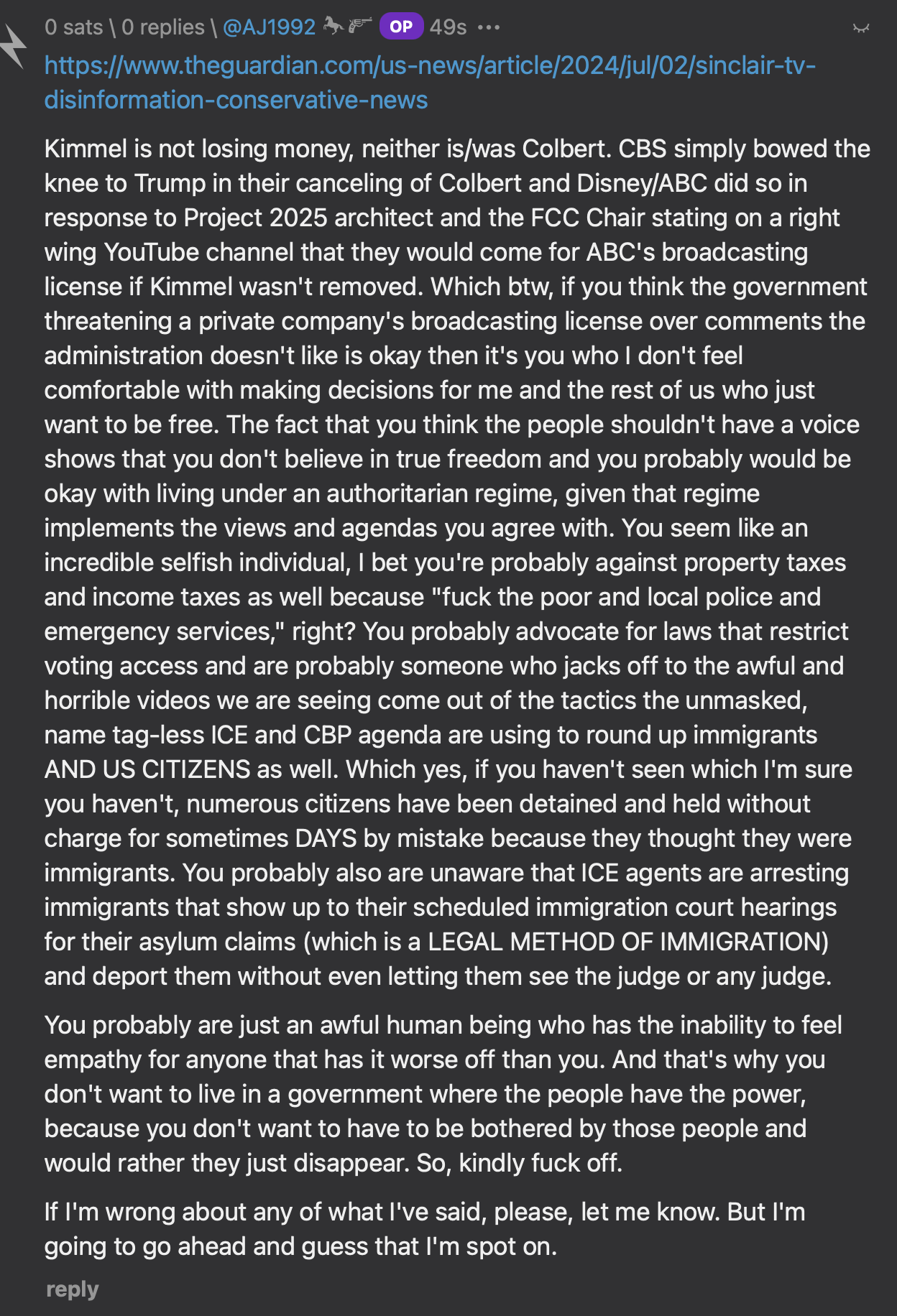Kimmel is not losing money, neither is/was Colbert. CBS simply bowed the knee to Trump in their canceling of Colbert and Disney/ABC did so in response to Project 2025 architect and the FCC Chair stating on a right wing YouTube channel that they would come for ABC's broadcasting license if Kimmel wasn't removed. Which btw, if you think the government threatening a private company's broadcasting license over comments the administration doesn't like is okay then it's you who I don't feel comfortable with making decisions for me and the rest of us who just want to be free. The fact that you think the people shouldn't have a voice shows that you don't believe in true freedom and you probably would be okay with living under an authoritarian regime, given that regime implements the views and agendas you agree with. You seem like an incredible selfish individual, I bet you're probably against property taxes and income taxes as well because "fuck the poor and local police and emergency services," right? You probably advocate for laws that restrict voting access and are probably someone who jacks off to the awful and horrible videos we are seeing come out of the tactics the unmasked, name tag-less ICE and CBP agenda are using to round up immigrants AND US CITIZENS as well. Which yes, if you haven't seen which I'm sure you haven't, numerous citizens have been detained and held without charge for sometimes DAYS by mistake because they thought they were immigrants. You probably also are unaware that ICE agents are arresting immigrants that show up to their scheduled immigration court hearings for their asylum claims (which is a LEGAL METHOD OF IMMIGRATION) and deport them without even letting them see the judge or any judge.