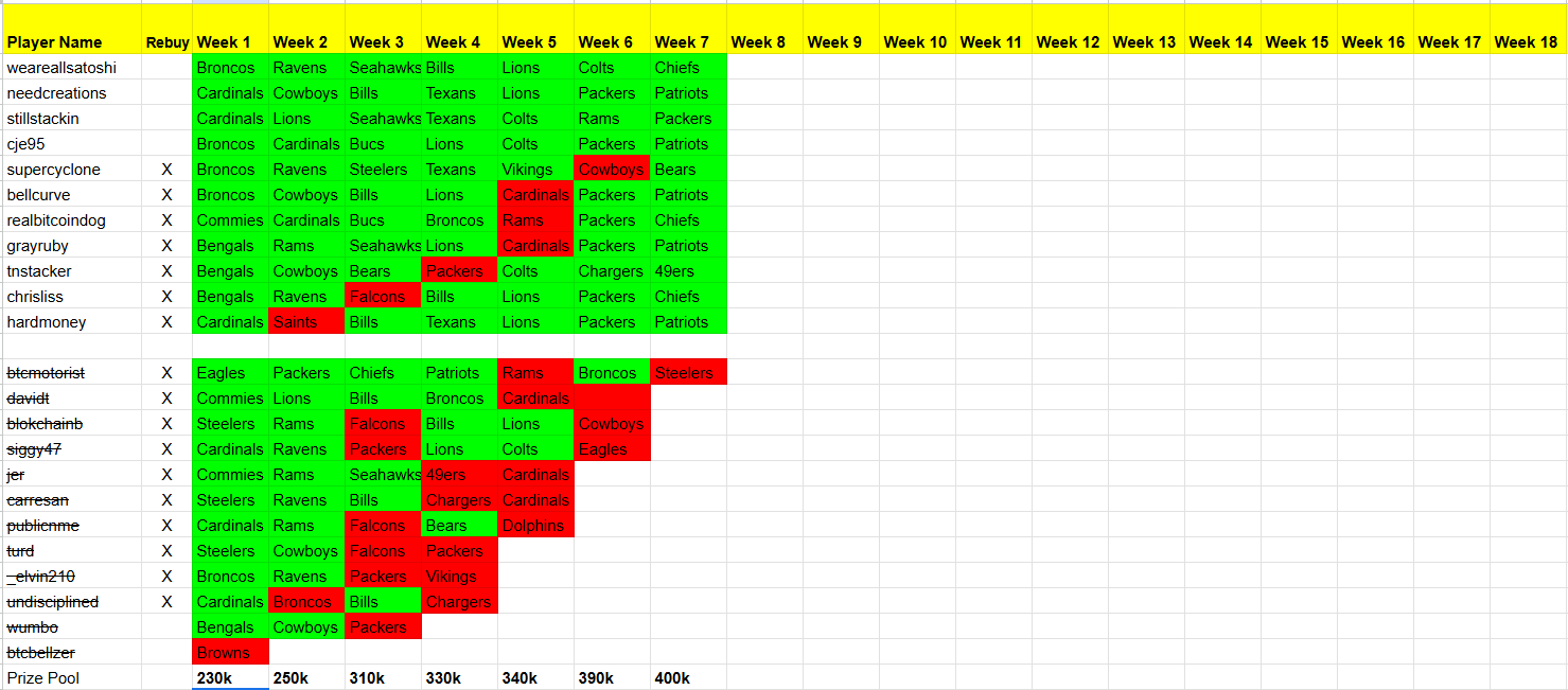 "If you are eliminated, there will be one opportunity per player to buy back into the pool (also 10,000 sats) up until week 10 (you can buy back in for a loss in week 9 or anytime before but not after). There will be no rebuys permitted after week 10. If eliminated and you wish to buy back in, you must submit your rebuy payment and pick in time for the upcoming week's selection deadline. Reminder a team cannot be selected more than once (if you lose with the Chiefs in week 1 and choose to rebuy, the Chiefs are still off the board for you). Anytime after week 5 the last player to use the rebuy will be eligible for 20% of the final pot if they do not win the whole pool. This also comes into effect if one player reaches the rebuy deadline without using a rebuy. If multiple players are tied as last to use the rebuy or reach the rebuy deadline without using it the 20% payout is void and goes to the final pot. The lone survivor at the end of the pool wins either 80% or 100% of the pot depending on the outcome of the rebuy rule payout above."