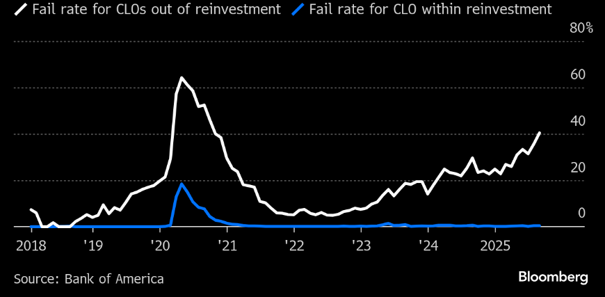 What do I need to know? CLOs that have exited the reinvestment period, when managers can no longer replace low-quality loans with better ones, have a default rate of 40%. This means that the value of the loans no longer covers the CLO's obligations, and payment on the riskiest tranches is suspended.