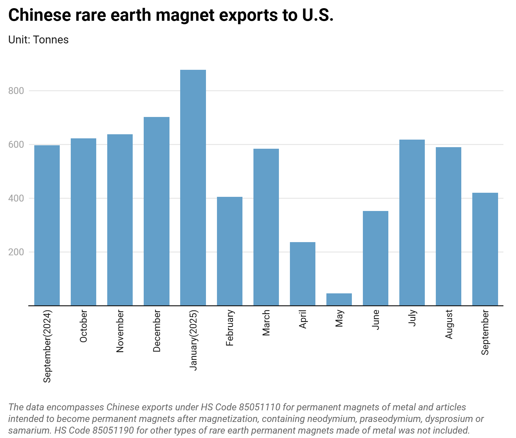 In May the amount exported was only a little over 46 tonnes and was right before the talks between the US and China in London when Beijing had agreed to expedite rare earth export permits.