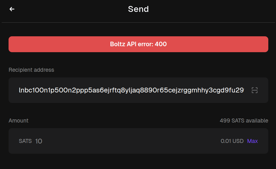 It seems like Arkade is trying to use a Boltz swap to send my 10 sats and likely this is uneconomical, and so it produces an error. I increased the amount to 333 sats and was able to successfully make the transaction.
