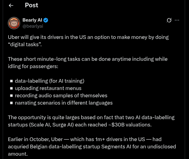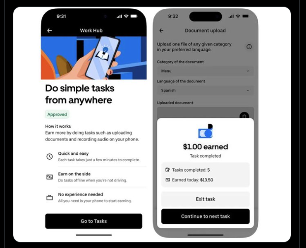 Uber Technologies Inc. is giving some drivers in the US the option to earn money by completing tasks related to the company’s nascent data labelling business, an area where the rideshare giant sees an opportunity to shine in the artificial intelligence boom.A new job category called “digital tasks” will appear in the Uber driver app for some workers later this fall, offering existing registered drivers the opportunity to make a few bucks if they take on simple assignments that can be completed within minutes, according to the company.Those stints currently include uploading documents like restaurant menus, or recording audio samples of themselves narrating a scenario in various languages, said Chief Product Officer Sachin Kansal. More tasks will be added over time, he said, and the payout will vary based on the time commitment of each assignment.