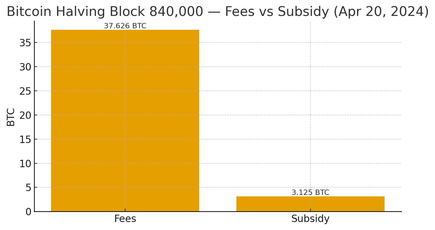 Fees 37.626 BTC vs Subsidy 3.125 BTC (block 840,000)