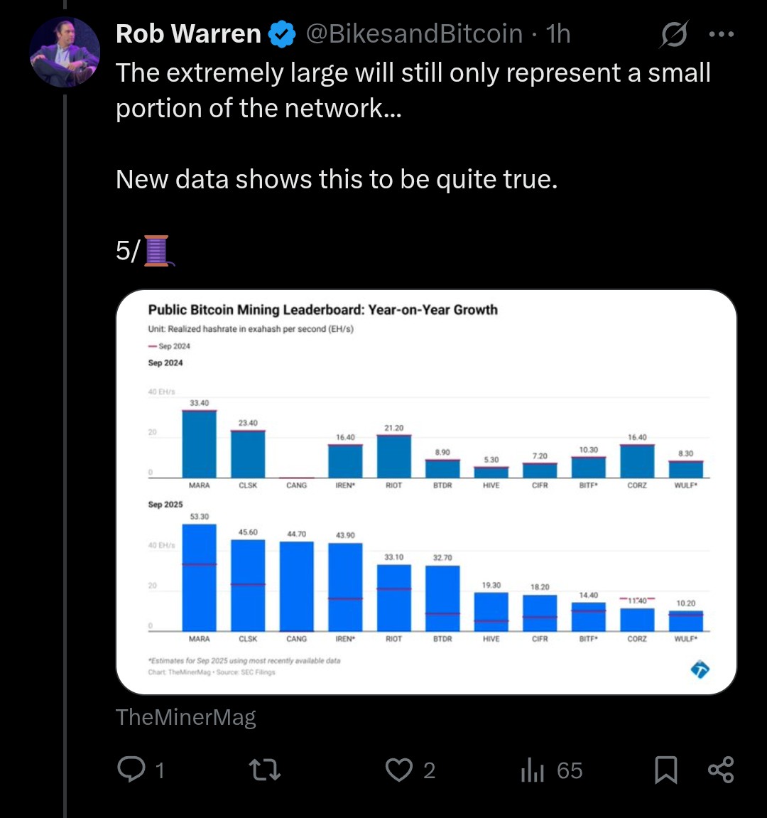 This would seem to prove out Satoshi's "Long Tail" assumption.Yes, there are massive, massive public mining operations, but individually, the largest represents less than 5% of the network (MARA), and collectively, 11 of them represent less than 30% of the entire network.Add to that their varying geographies, jurisdictions, and regulatory regimes, and the possibility of massive collusion to the detriment of the network seems fleeting, if not impossible....